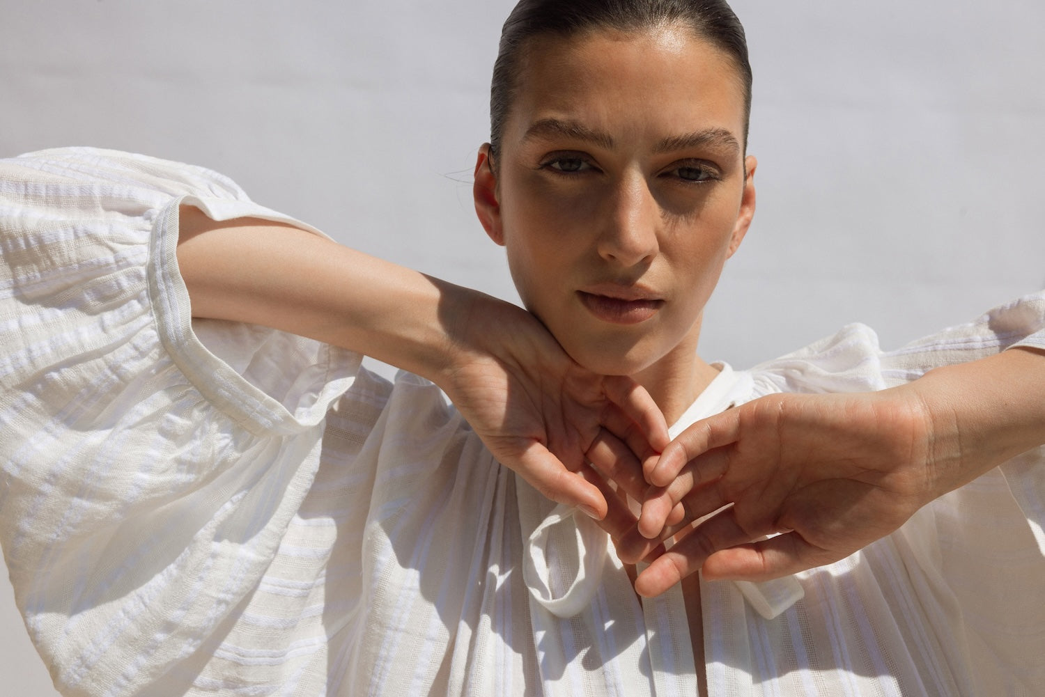Beautifully crafted in soft white cotton cheesecloth, The Whisper Blouse features a gathered neckline, centre-front tie, and voluminous balloon sleeves. Floaty and effortless.