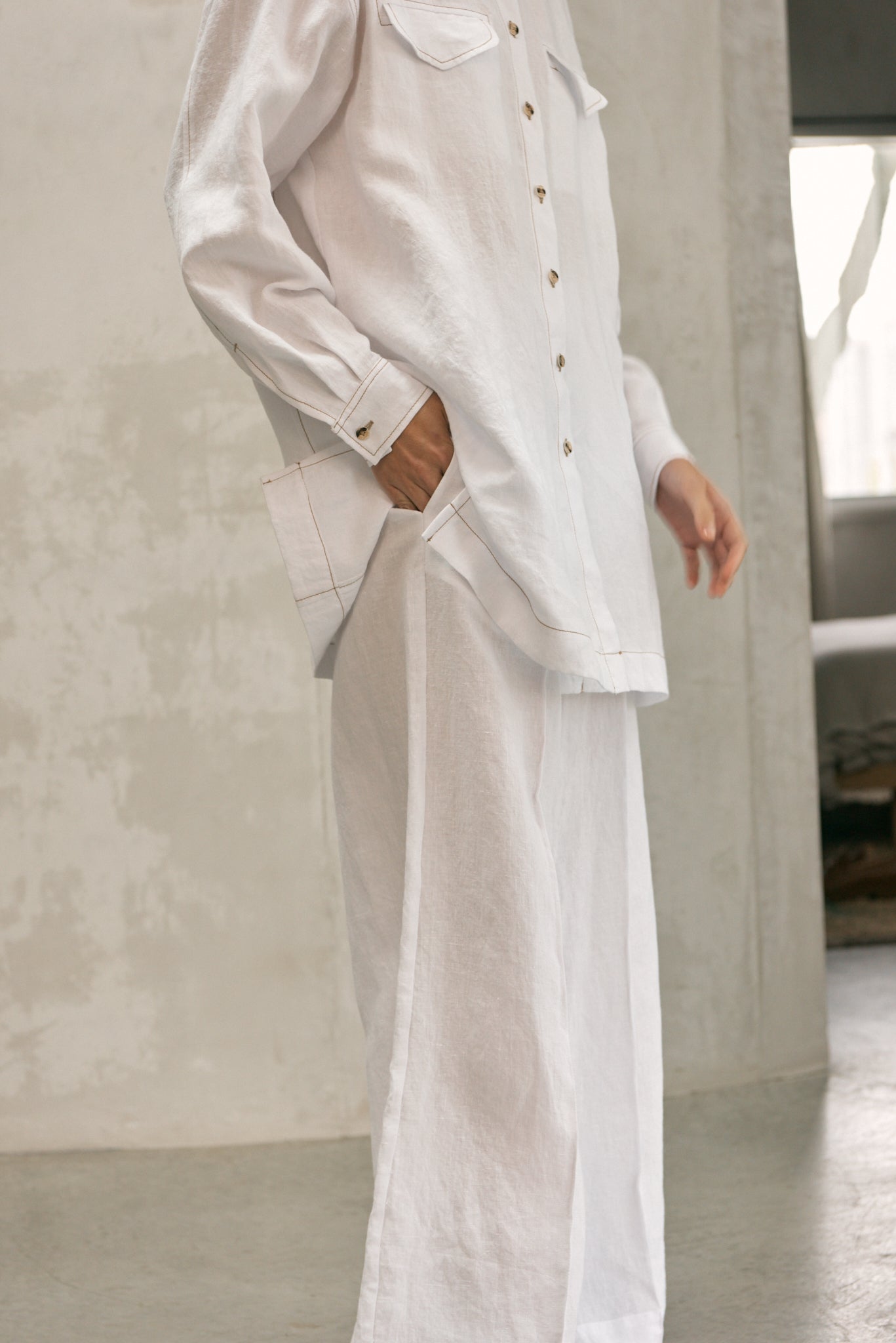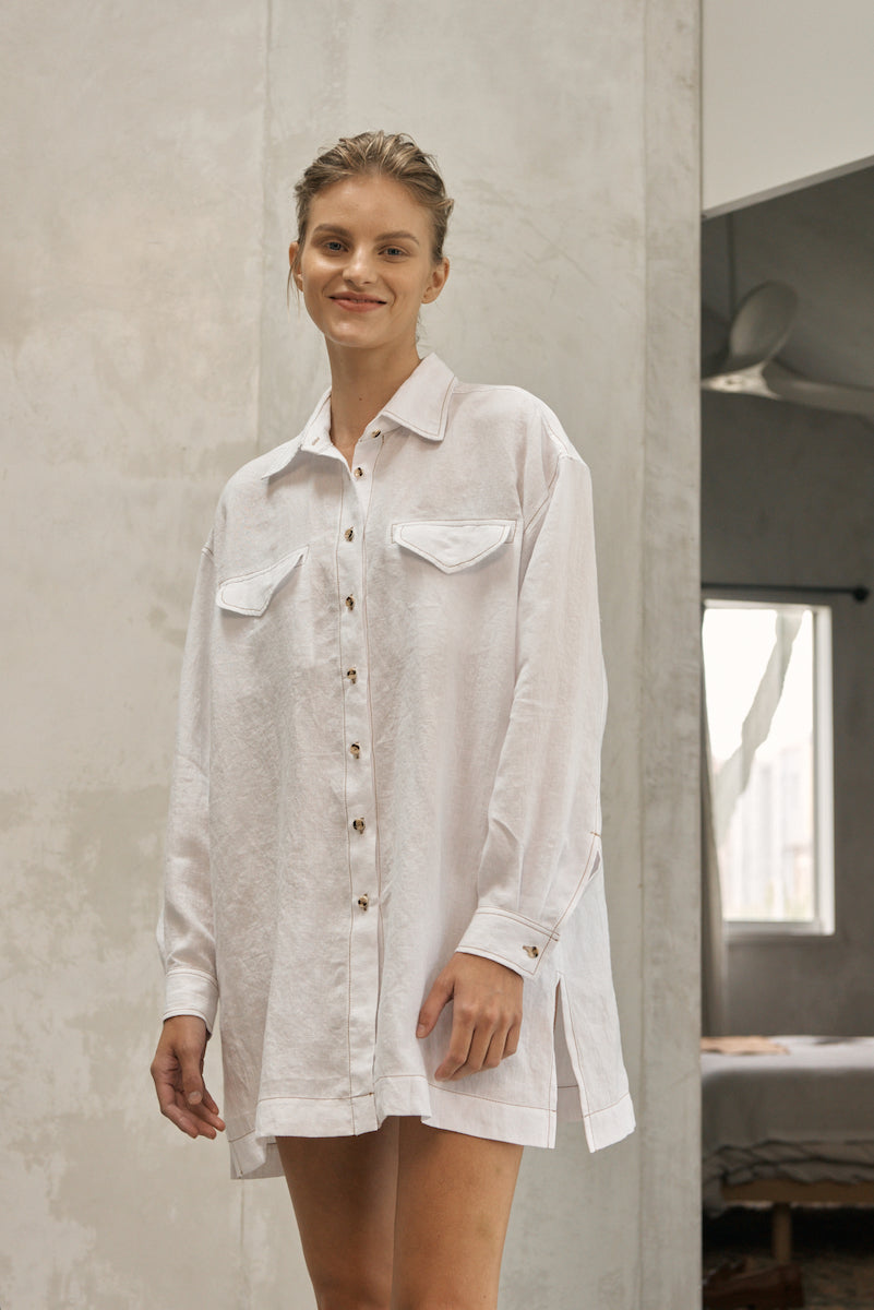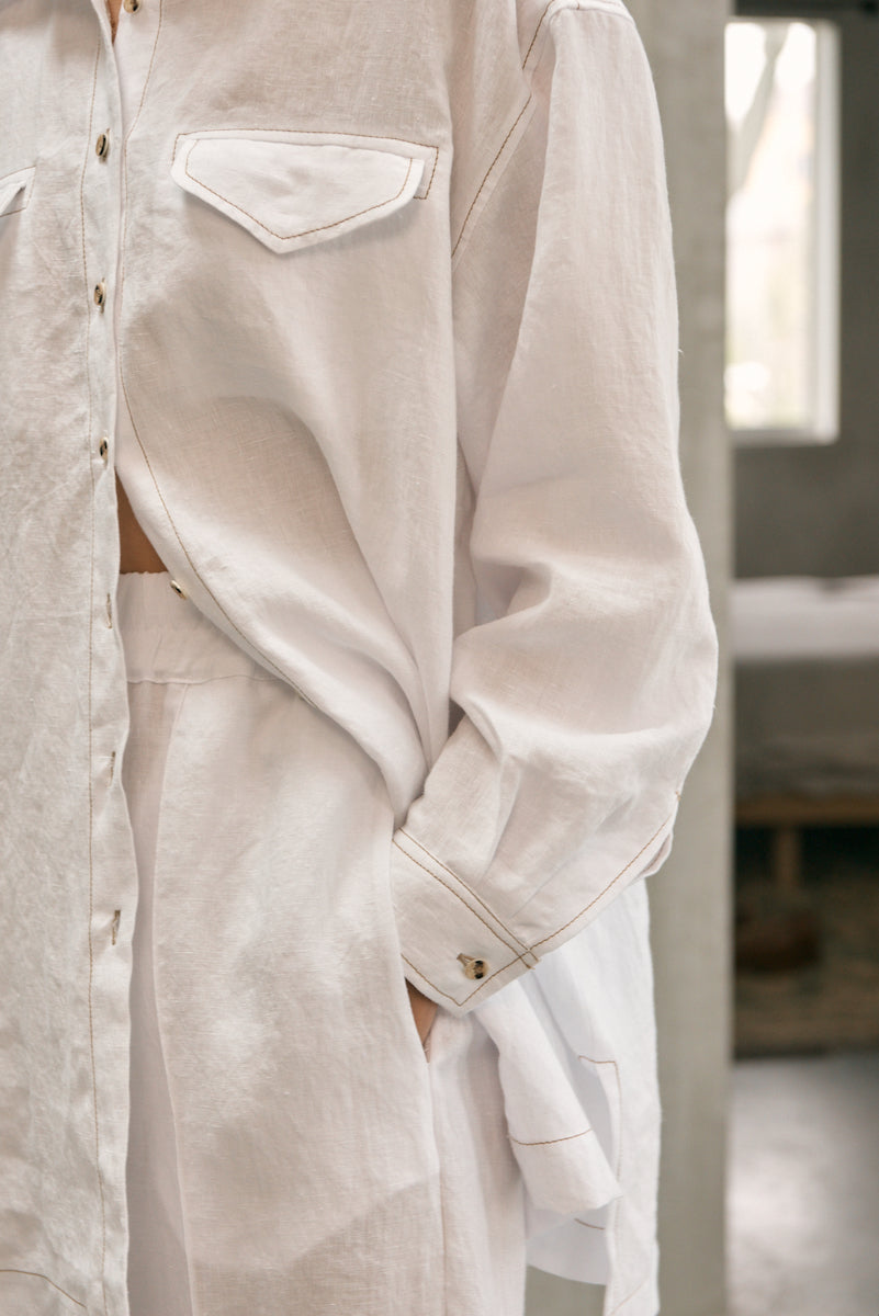 This relaxed fit shirt is crafted in a washed 100% linen and features contrast tan stitch detailing. Featuring high end tailoring to create a classic shape with simplicity in mind. Wear with the matching Social Slacks for the complete set.