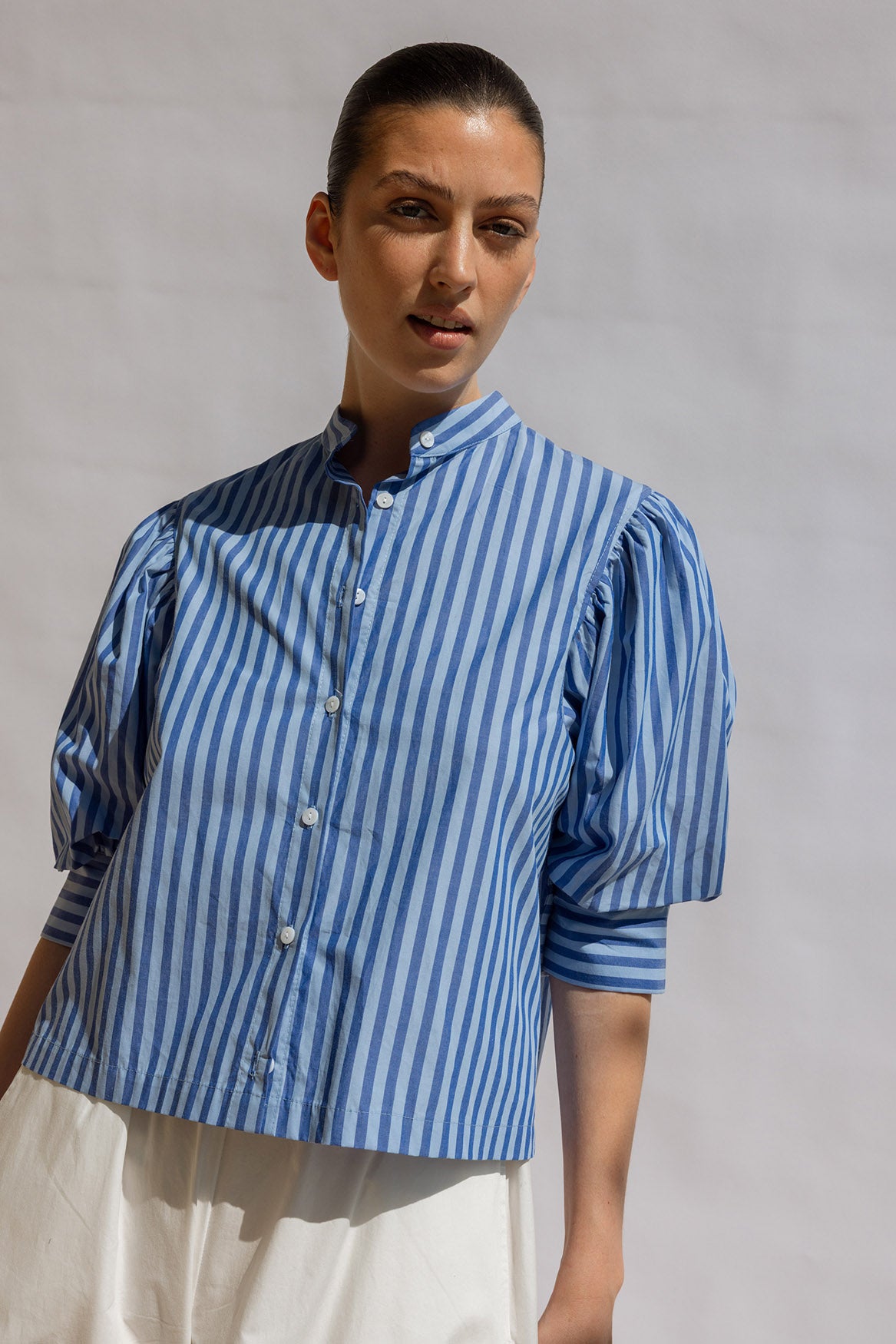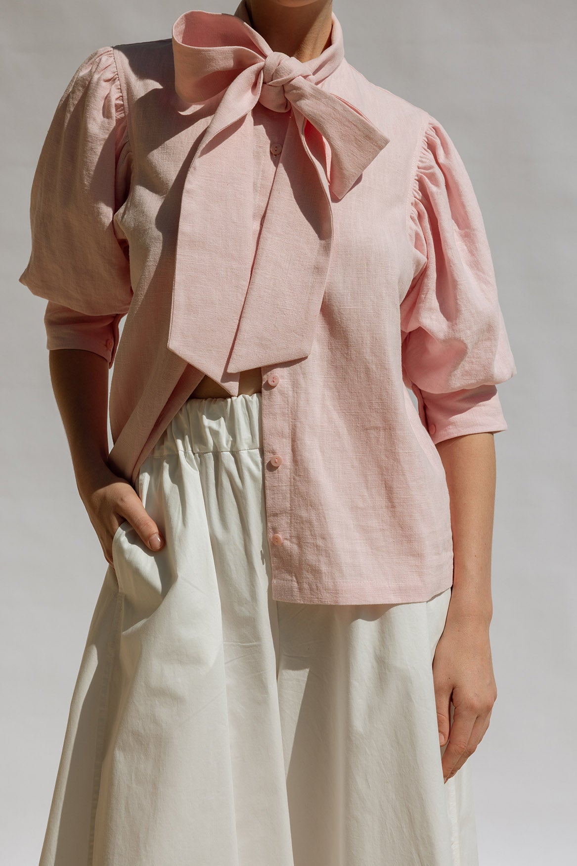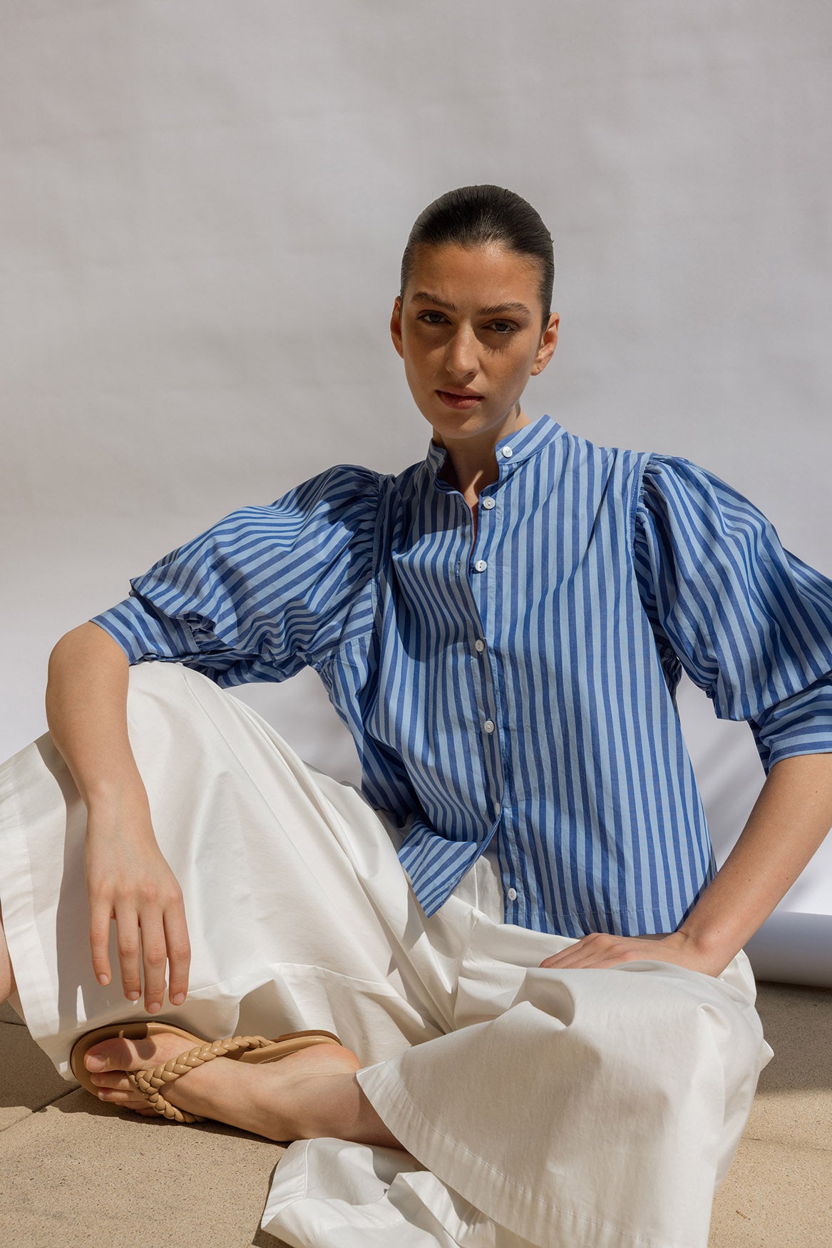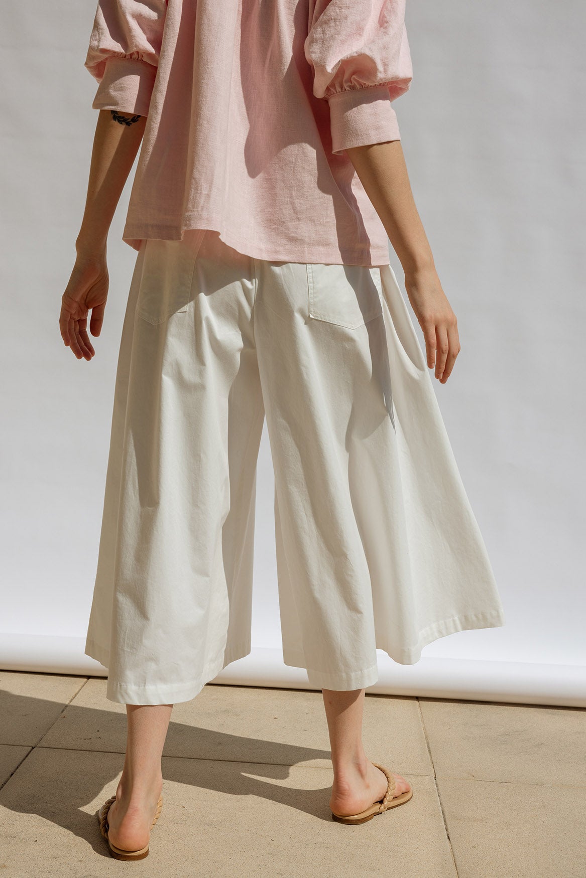 A voluminous, trapeze-shaped pant in crisp white cotton poplin. Cropped with an A-line silhouette, it moves like a skirt while maintaining effortless, elevated elegance. Pair it with the new Paloma Shirt, the bow-front Flora Shirt, or the Trapeze Top for a chic, sculptural ensemble