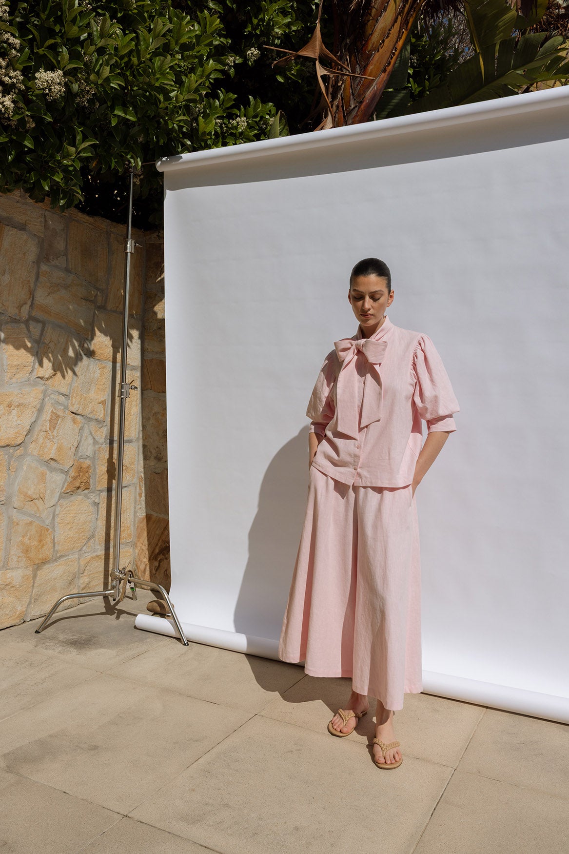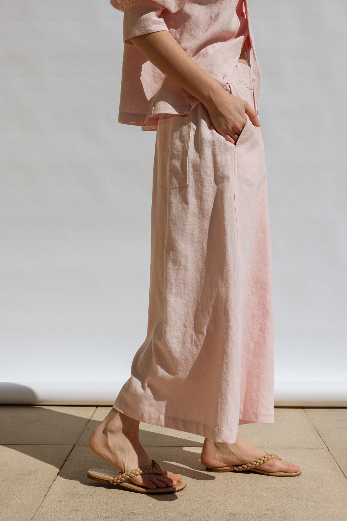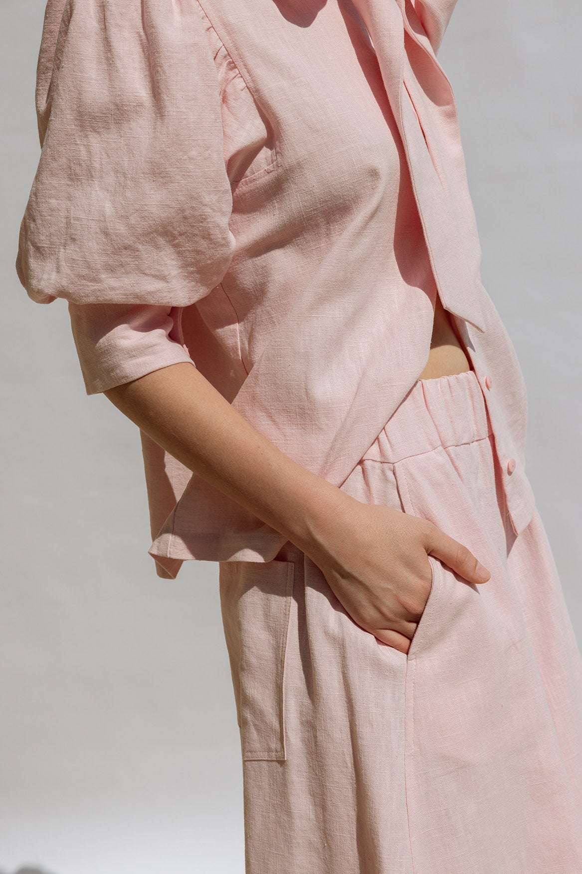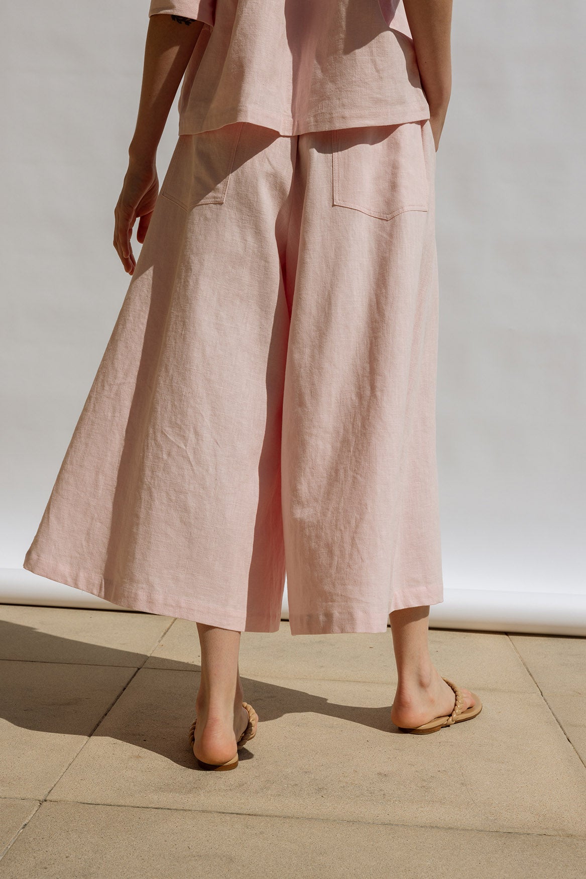 A voluminous, trapeze-shaped pant in luxurious Italian pink linen. Cropped with an A-line silhouette, it moves like a skirt while maintaining elevated elegance. Designed as a coordinated set with the Flora Shirt, they also pair beautifully with the Trapeze Top for a sculptural, airy ensemble