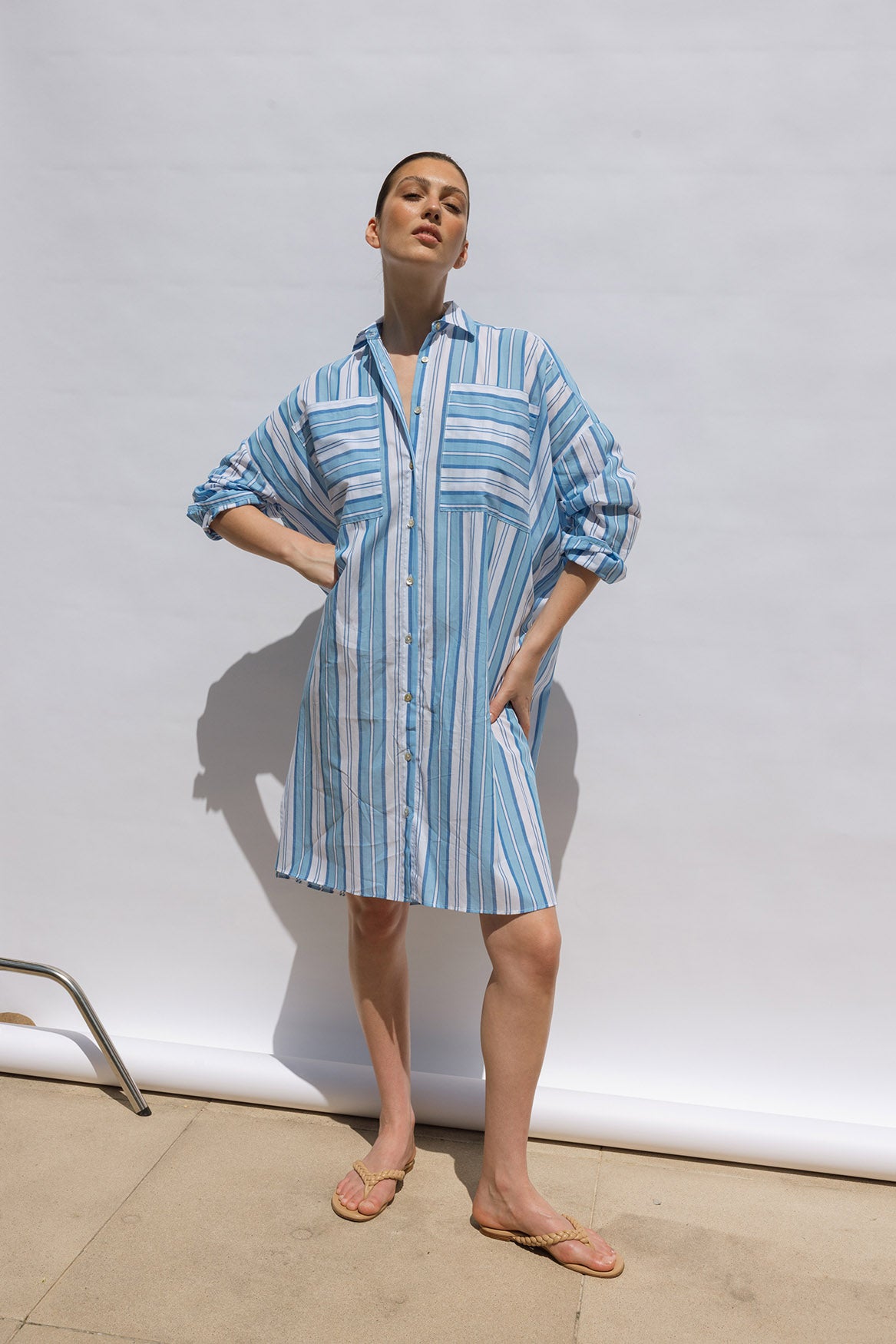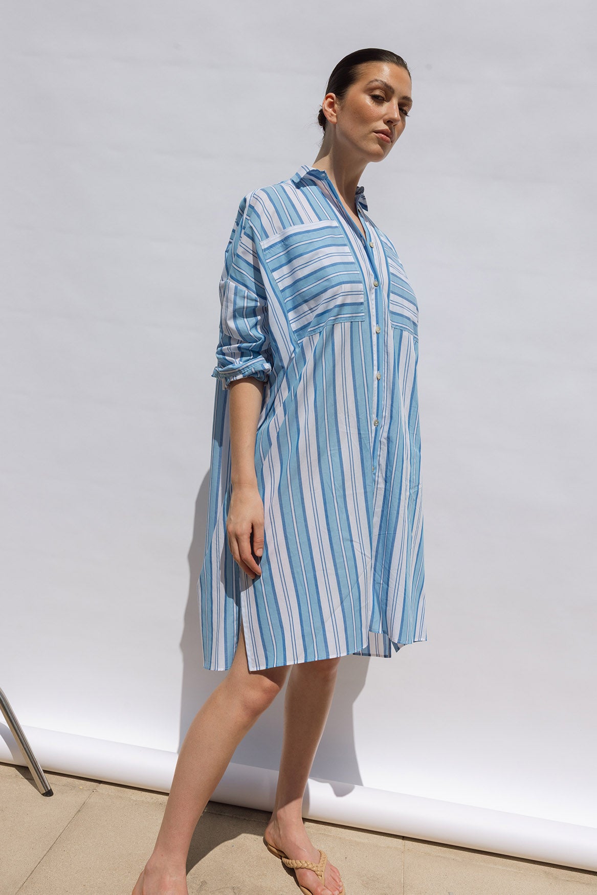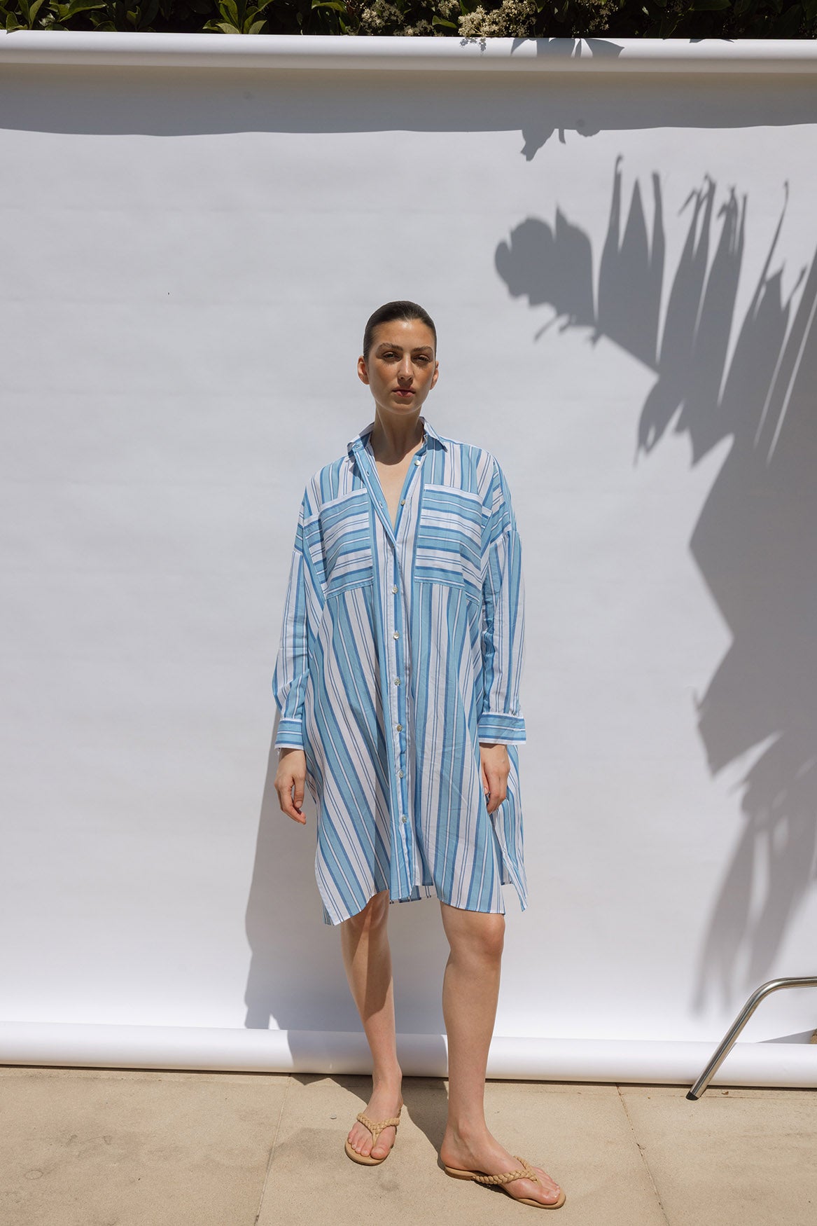 Our classic oversized shirt made from a summer cotton in a classic blue and white resort stripe. This oversized shape can be worn on its own as a dress or layer over pants and to throw on over swimwear at the beach. The Beach Shirt is finished off with a classic collar and oversized pockets on the front, featuring contrast stripe. The ultimate lightweight summer shirt.