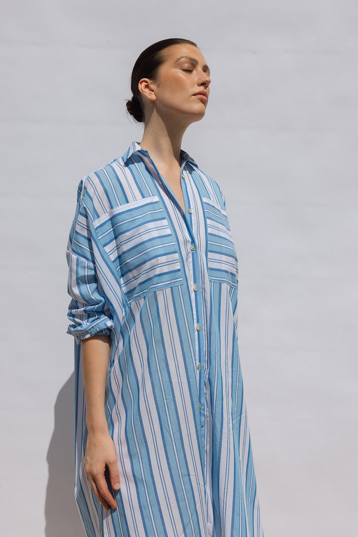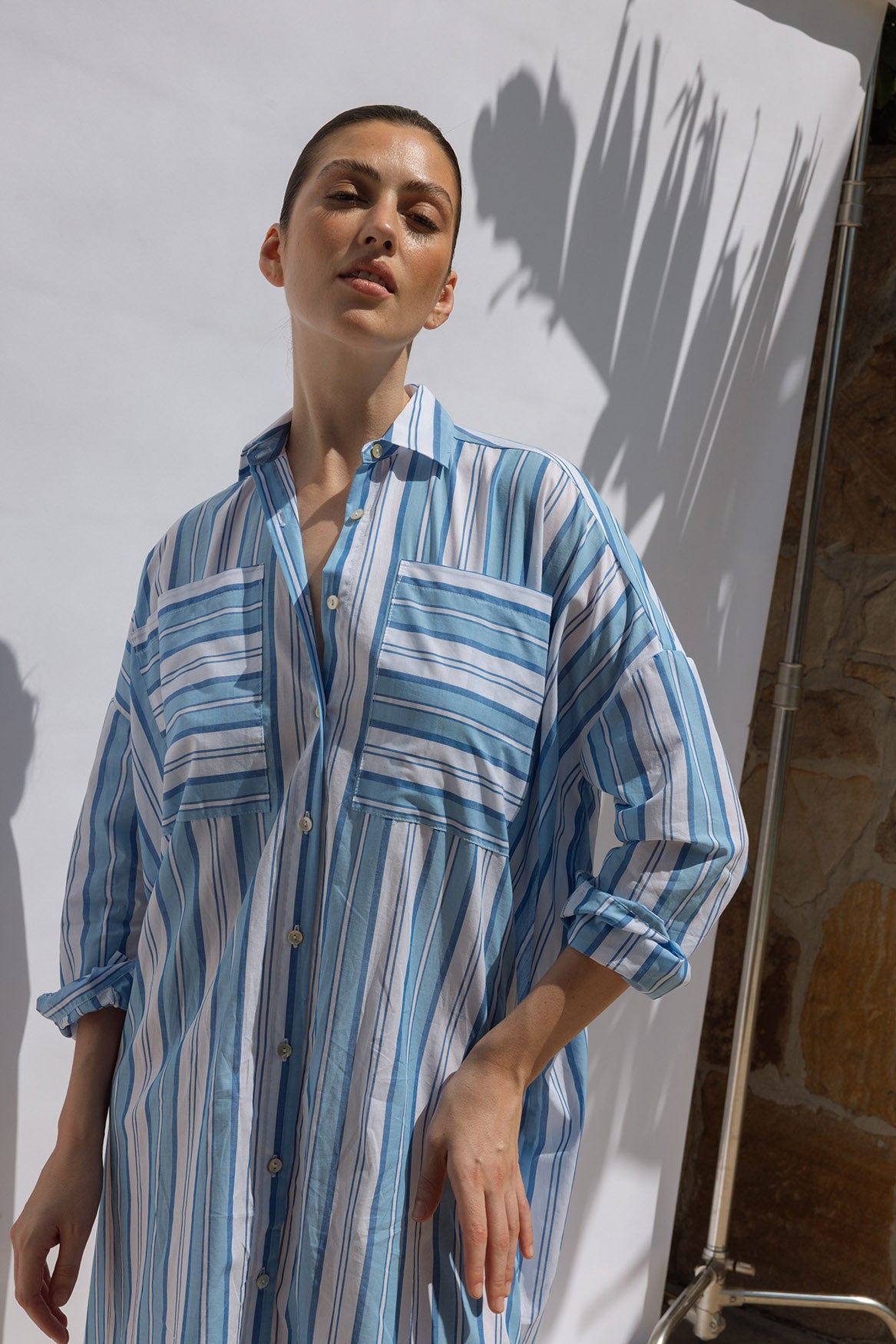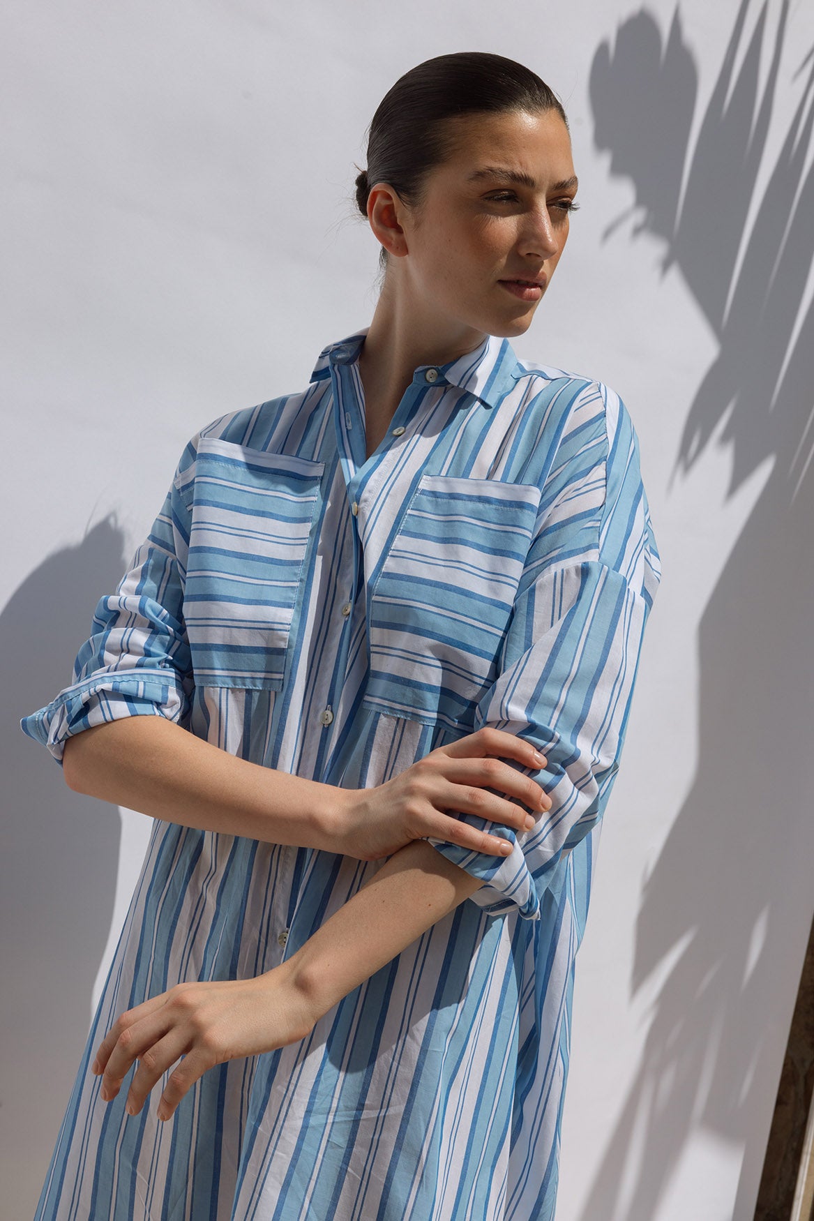 Our classic oversized shirt made from a summer cotton in a classic blue and white resort stripe. This oversized shape can be worn on its own as a dress or layer over pants and to throw on over swimwear at the beach. The Beach Shirt is finished off with a classic collar and oversized pockets on the front, featuring contrast stripe. The ultimate lightweight summer shirt.
