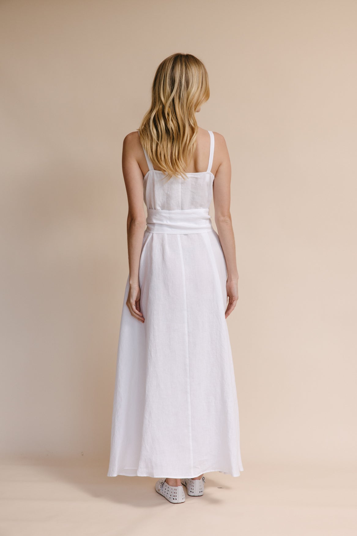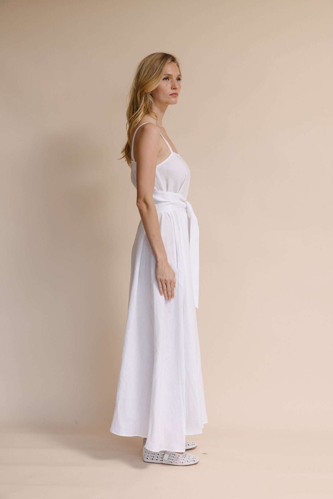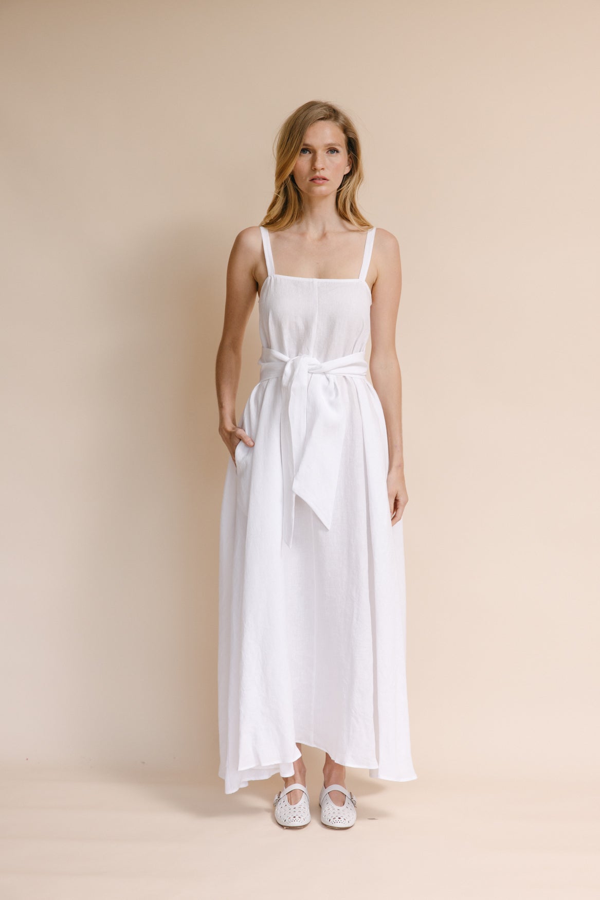 A classic shape crafted in a 100% crisp white linen. This style is great for travel and the linen allows you to wash it out and dry overnight ready to wear the next day. Featuring a classic square neckline, a voluminous a-line skirt and a matching linen belt tie should you wish to cinch it in at the waist.