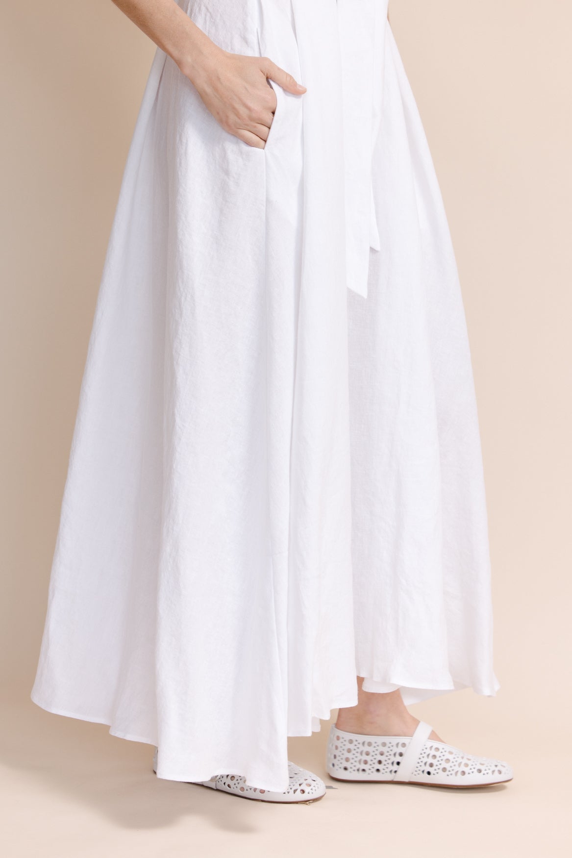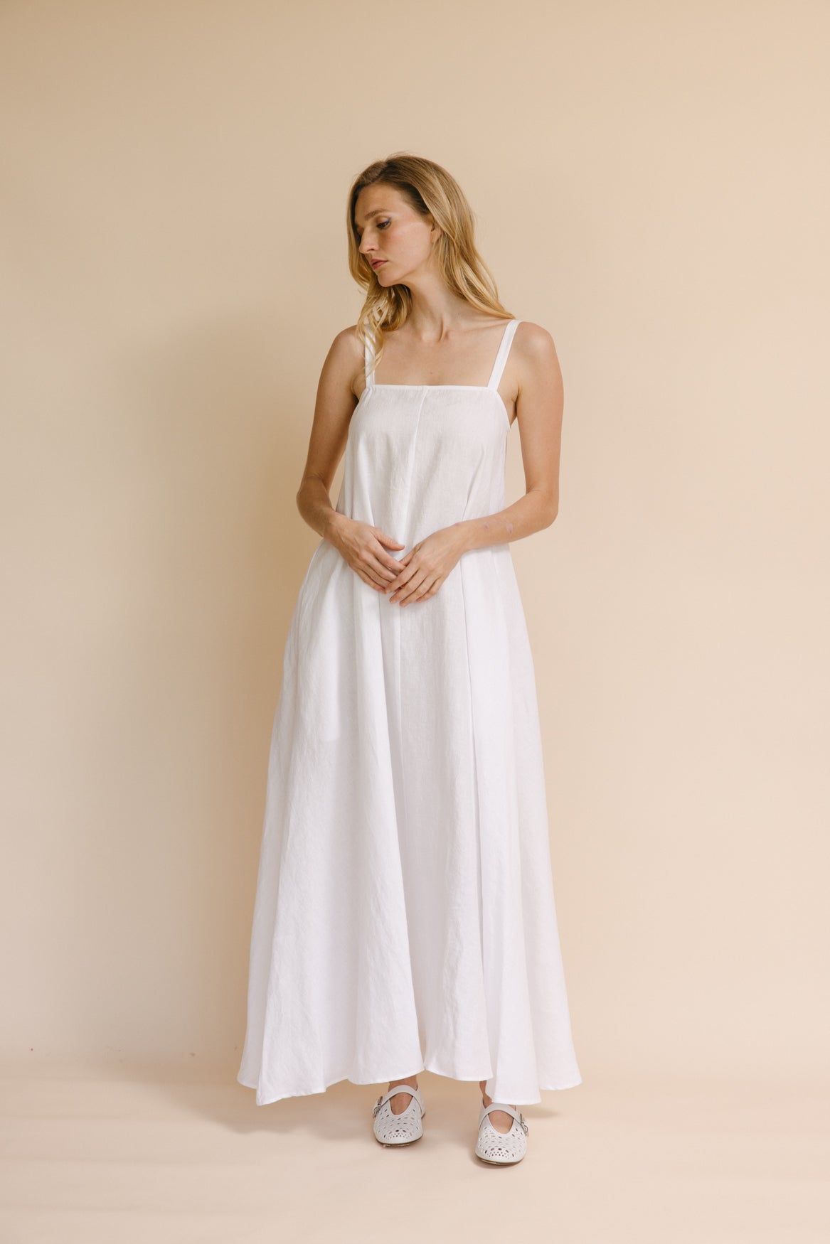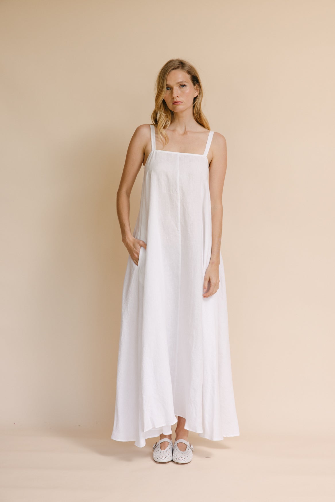 A classic shape crafted in a 100% crisp white linen. This style is great for travel and the linen allows you to wash it out and dry overnight ready to wear the next day. Featuring a classic square neckline, a voluminous a-line skirt and a matching linen belt tie should you wish to cinch it in at the waist.