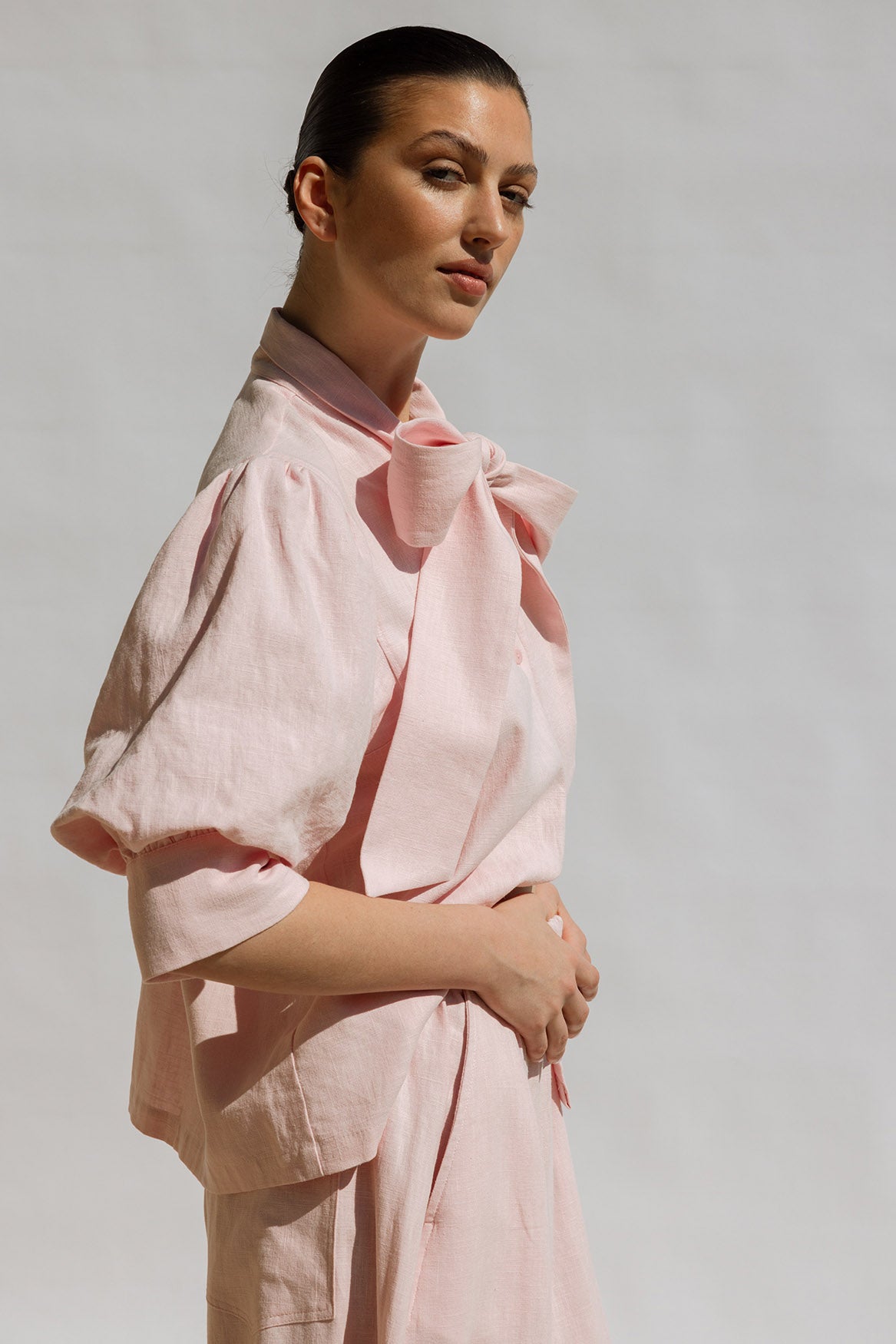 A feminine puff-sleeve shirt in luxurious Italian linen, tailored with lined short sleeves, a playful bow at the neck, and subtle pink buttons. Pairs beautifully with the Atelier Pant for a chic set or worn alone for effortless summer elegance.