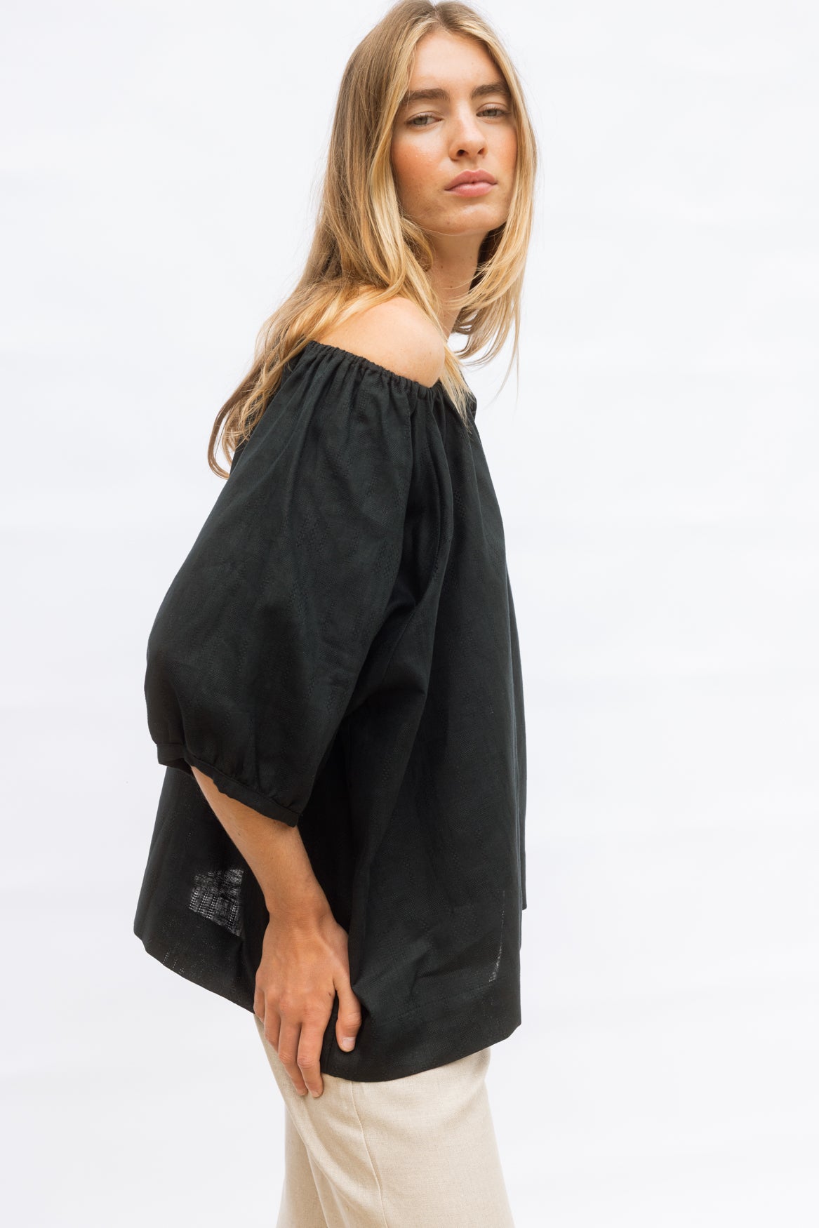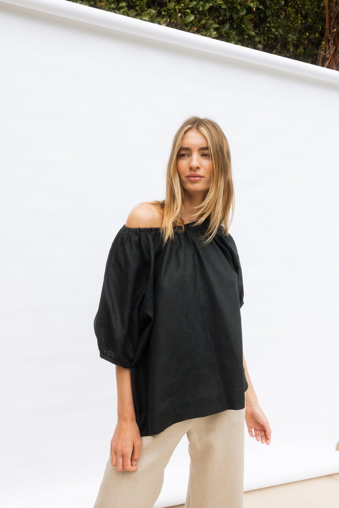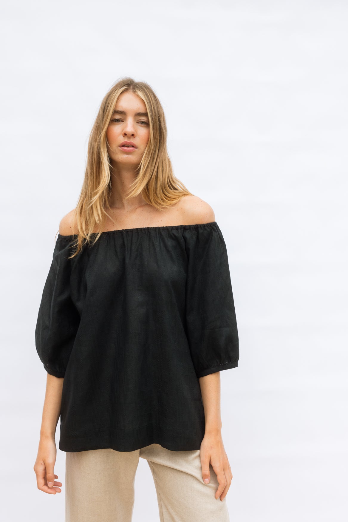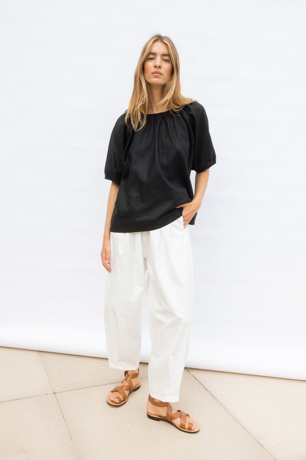 Inspired by sunlit travels and summer adventures, the Gypsy Top is a summer essential. Made from a crisp embroidered cotton-linen blend, it features a fine 1 cm elastic neckline that can sit on the shoulders or slip down for an off-the-shoulder silhouette. Pair with the white Afternoon Pant or the natural linen Travel Pant for easy, sun-ready dressing.