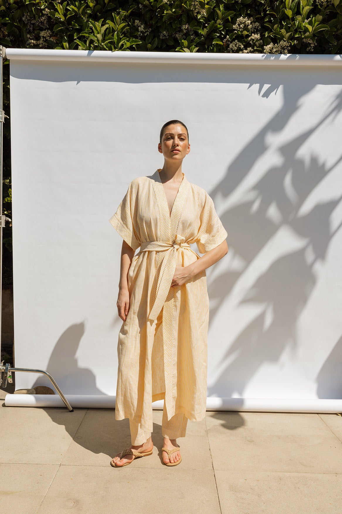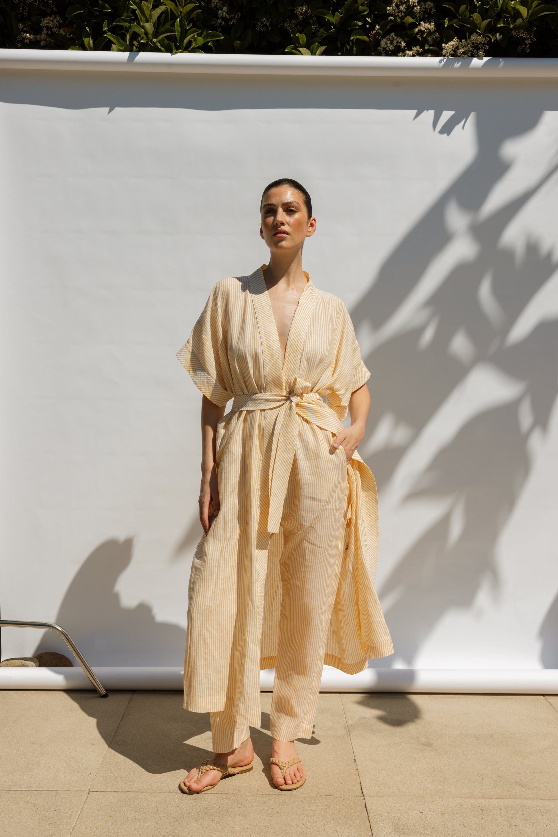 An easy, lightweight pant made for summer days. Crafted from 100% linen in yellow and white stripe, it features a relaxed, straight-leg silhouette with an elasticated waist for comfort. Designed to pair with the matching Kimono Wrap Dress for a coordinated look — or wear on its own with a simple tank or shirt for effortless holiday style.
