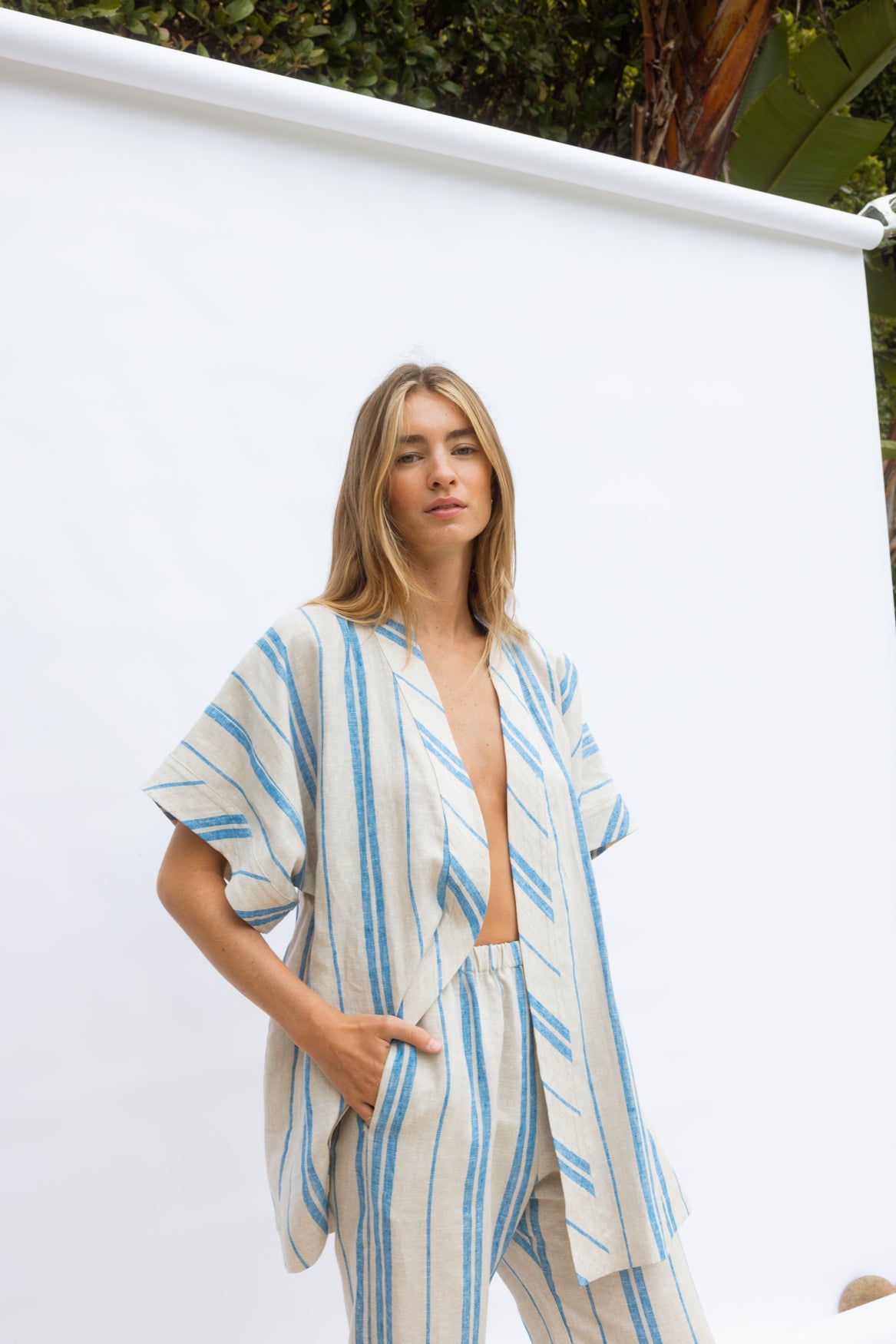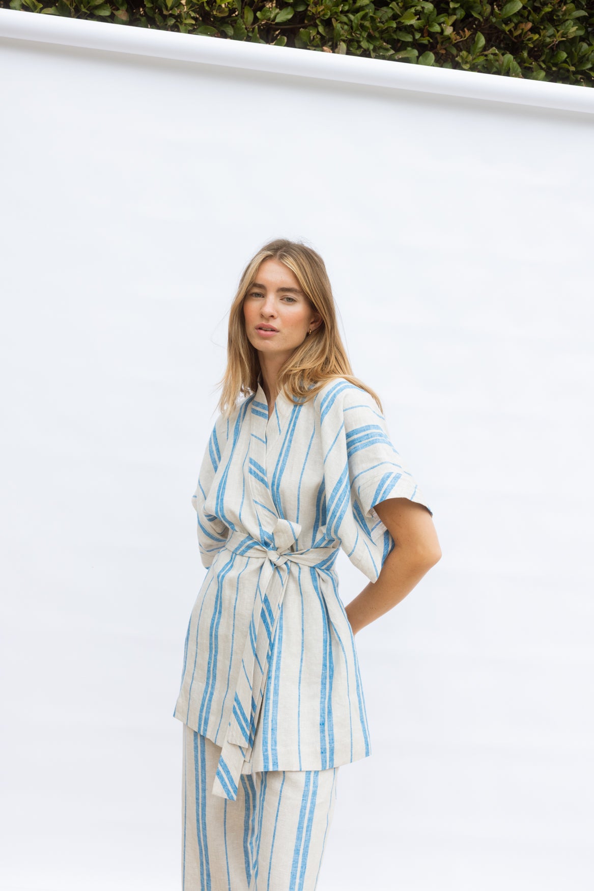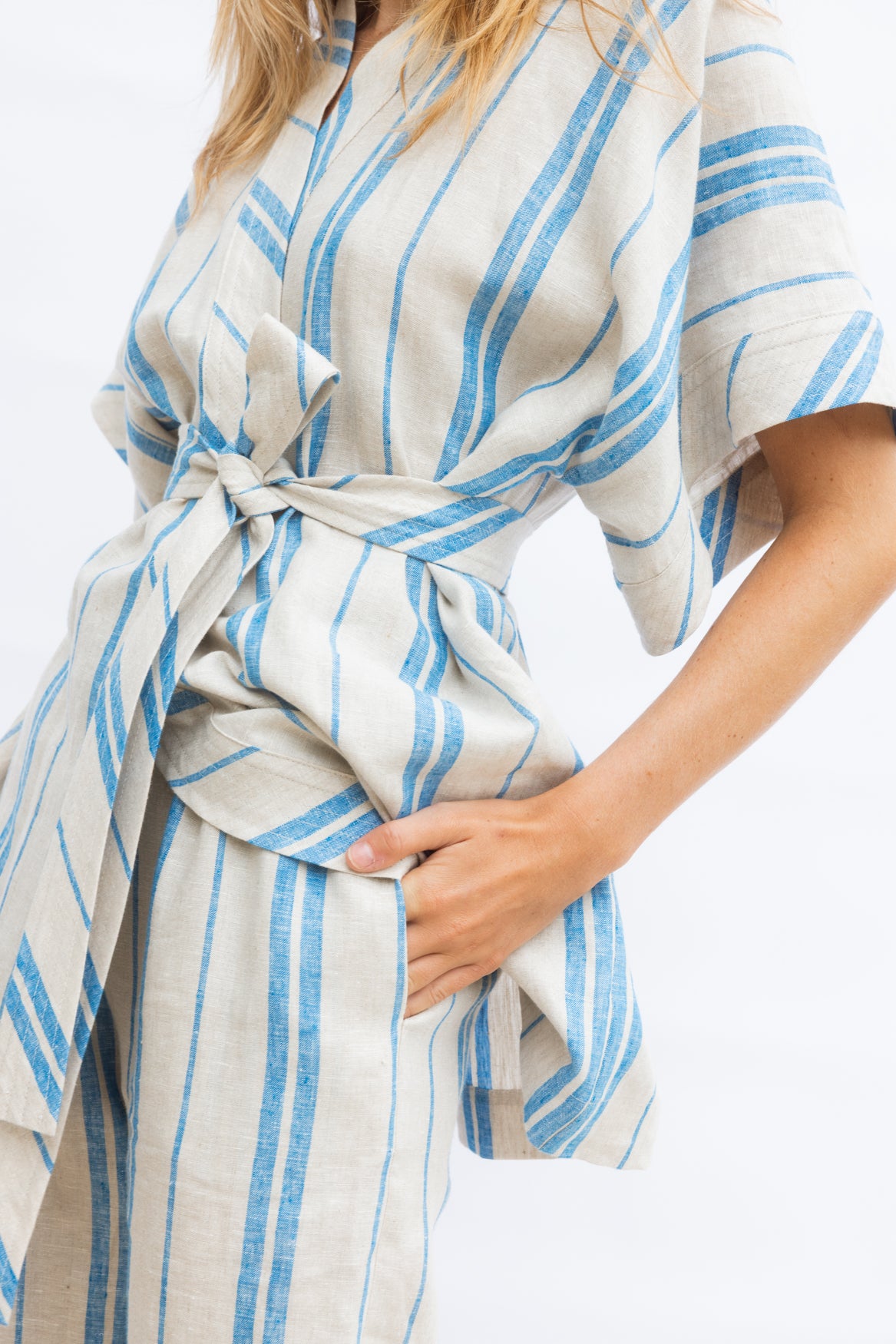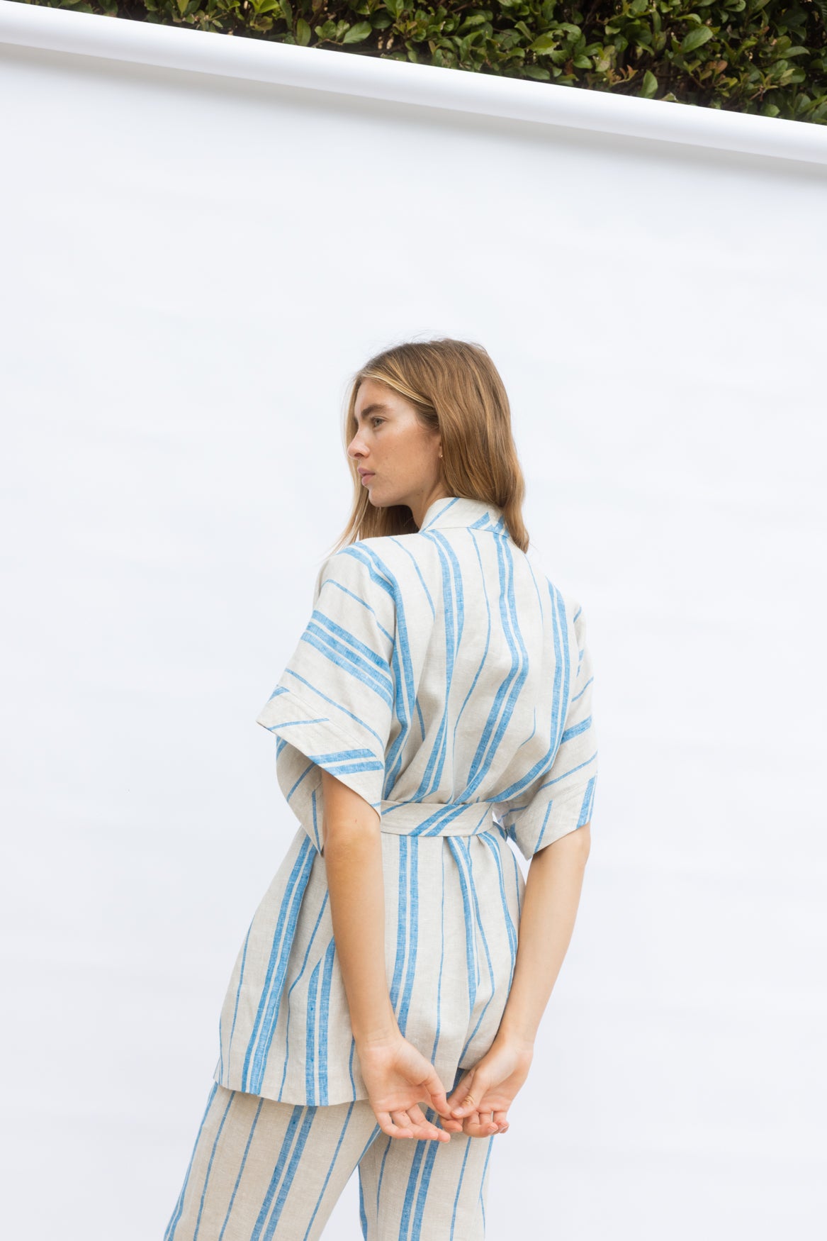A classic kimono-shaped shirt in 100% natural linen, featuring a bias-cut neck band and waist tie that highlights the contrasting stripe. Light and breathable, it pairs beautifully with the Travel Pant for a complete summer set.