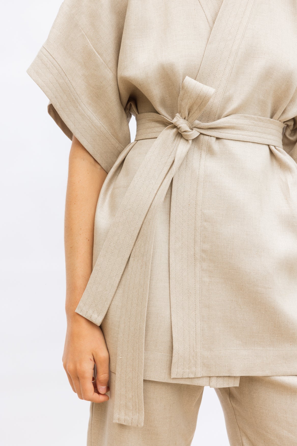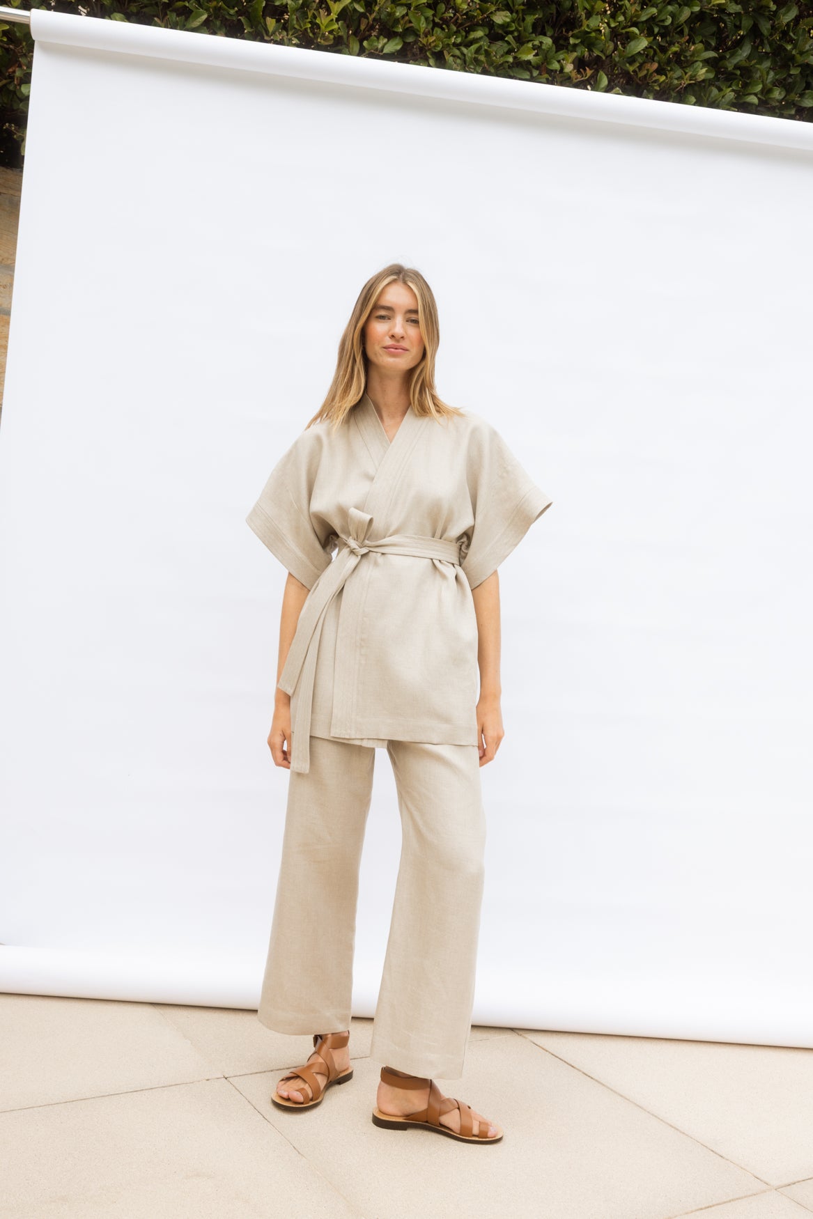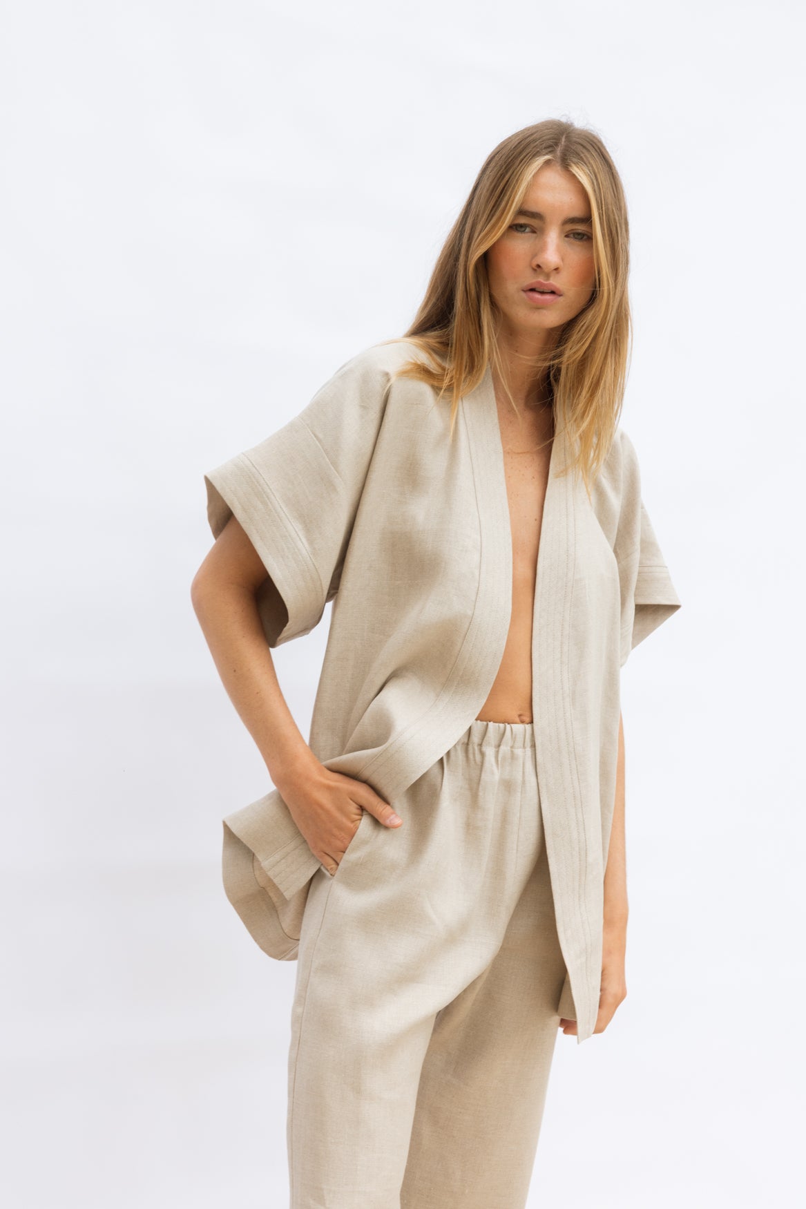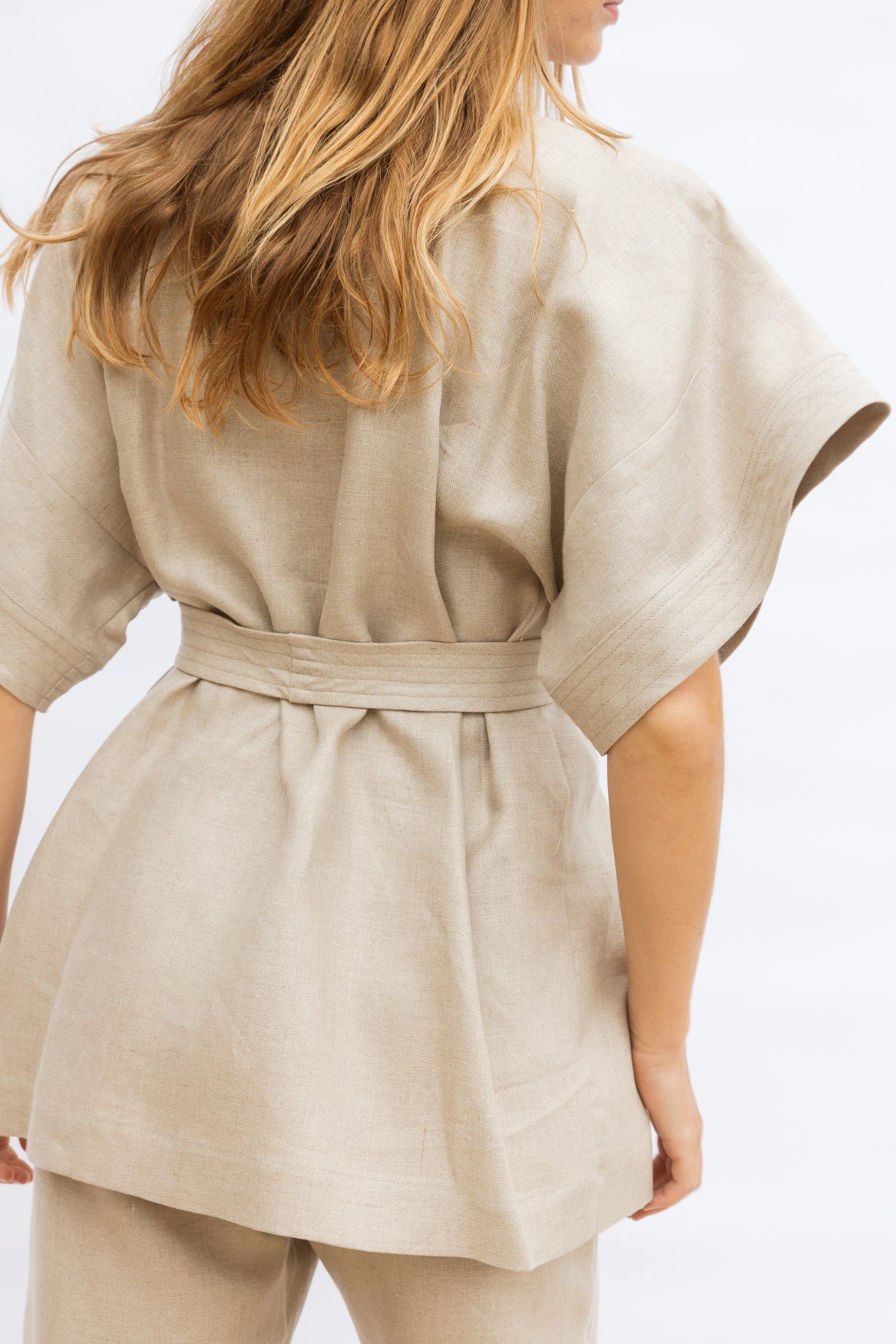 Classic kimono lines meet subtle structure. Made from 100% medium-weight twill linen, this top holds its shape beautifully while remaining breathable and comfortable. Layer over the Travel Pant for a polished summer set, or style with linen trousers or shorts for versatile, sun-ready dressing.