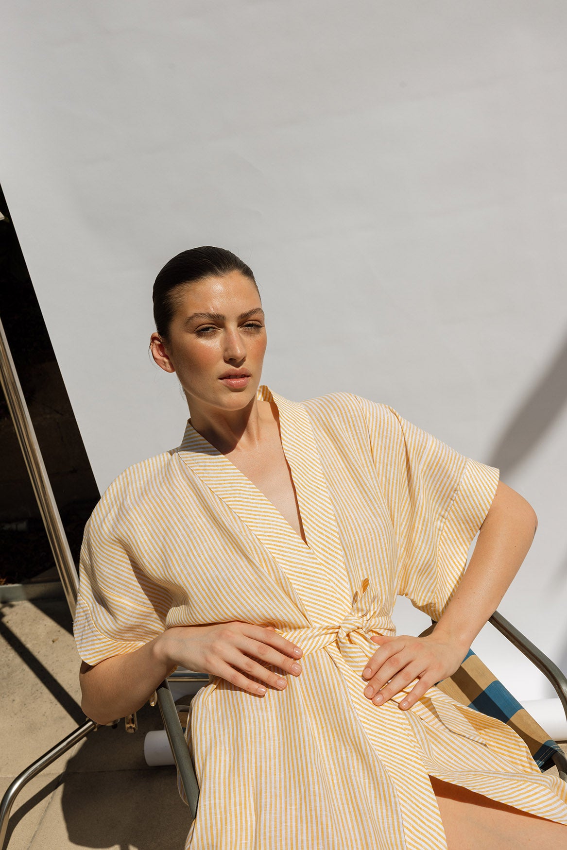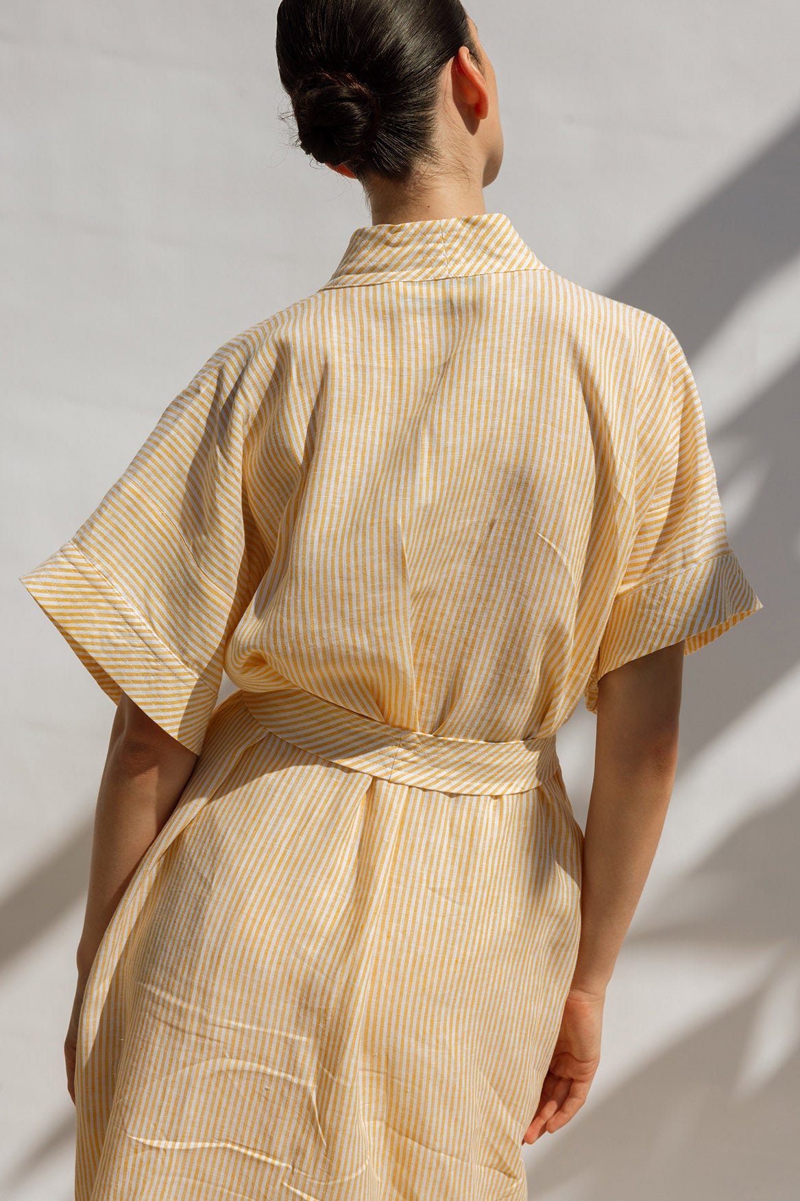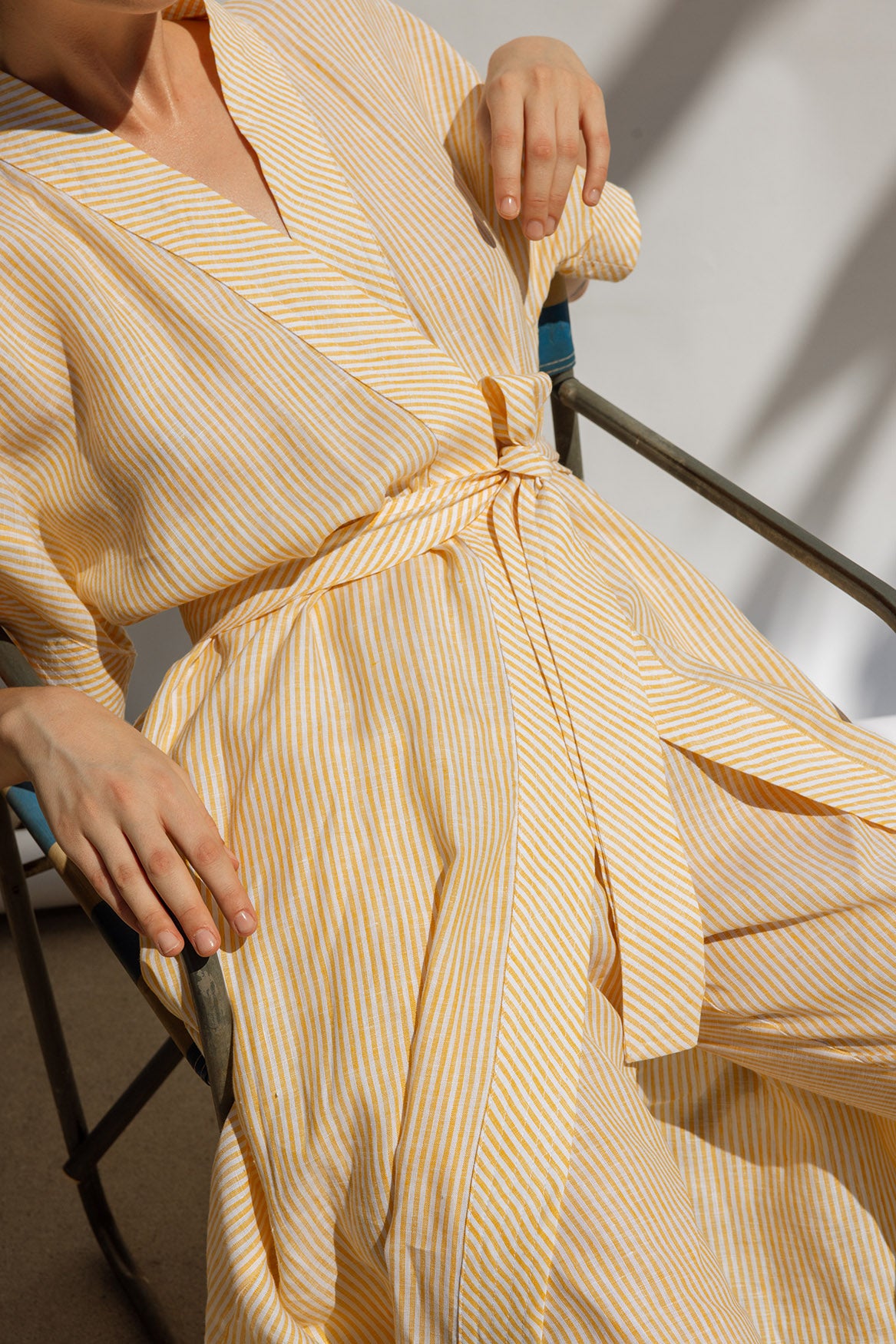 A timeless wrap dress in a classic kimono shape, crafted from 100% linen in a sunny yellow and white stripe. Designed with a waist tie for a flattering fit — wear it wrapped and tied for lunch, or loose over swimwear with a single button fastening. Light, airy, and effortless — a true summer essential.