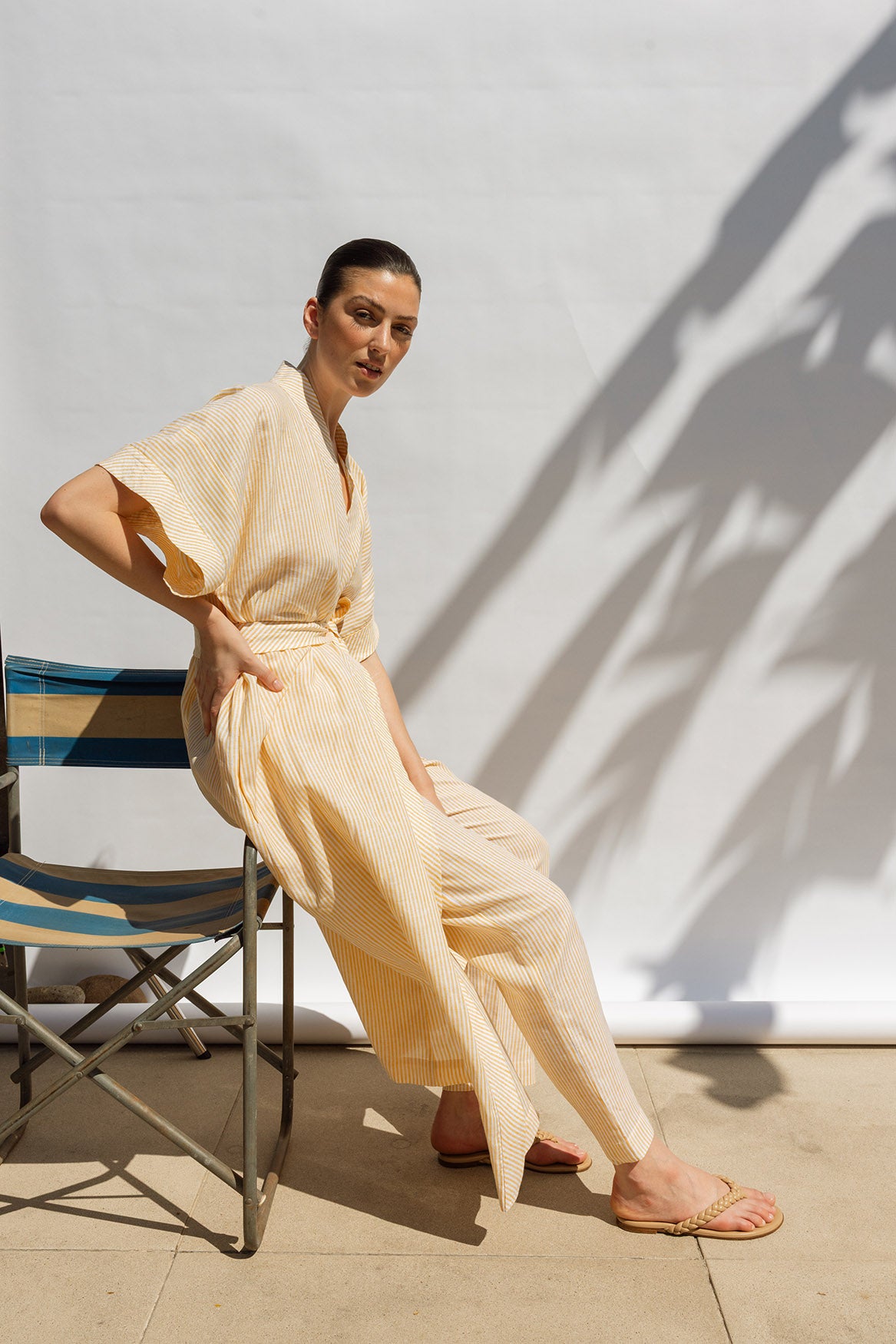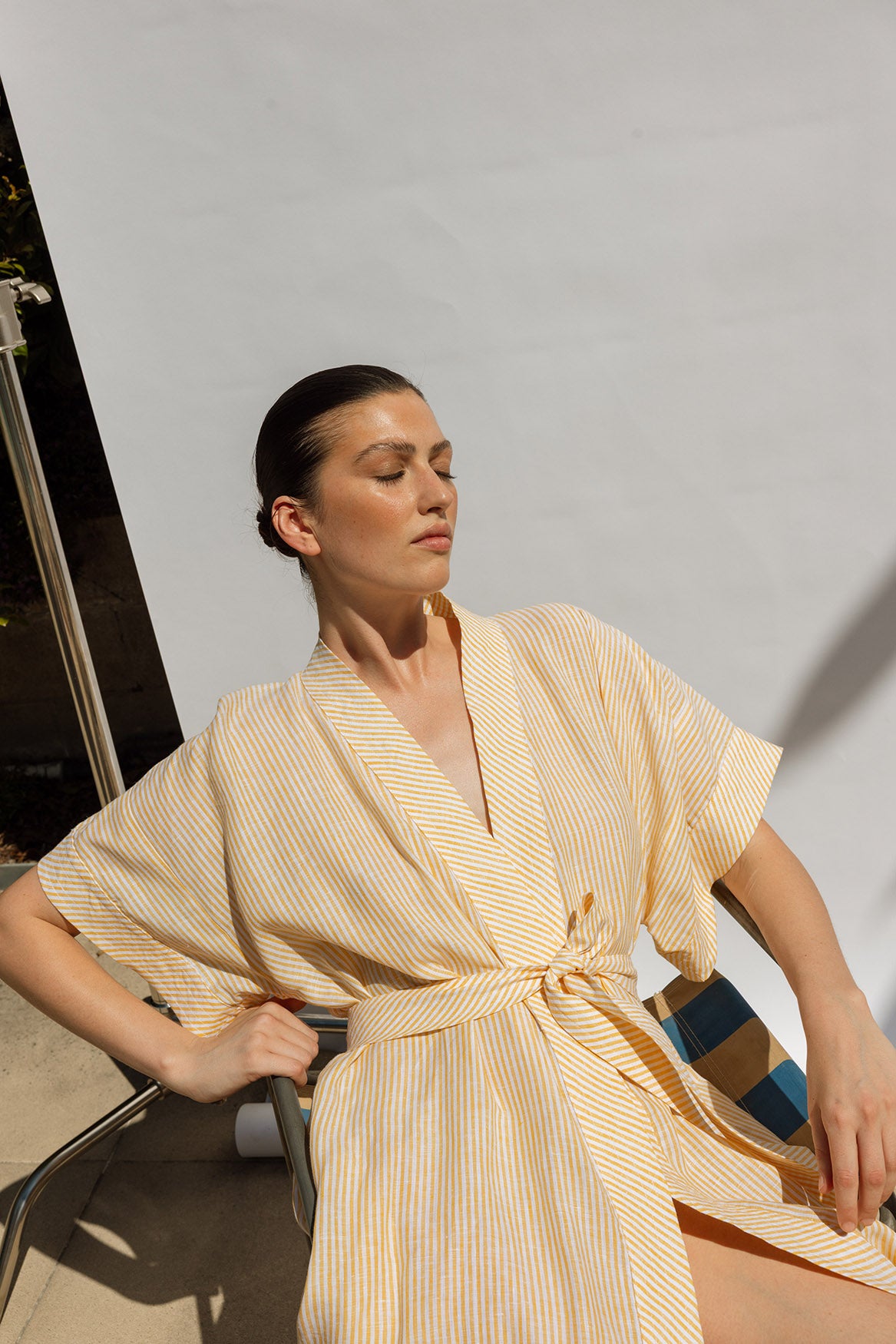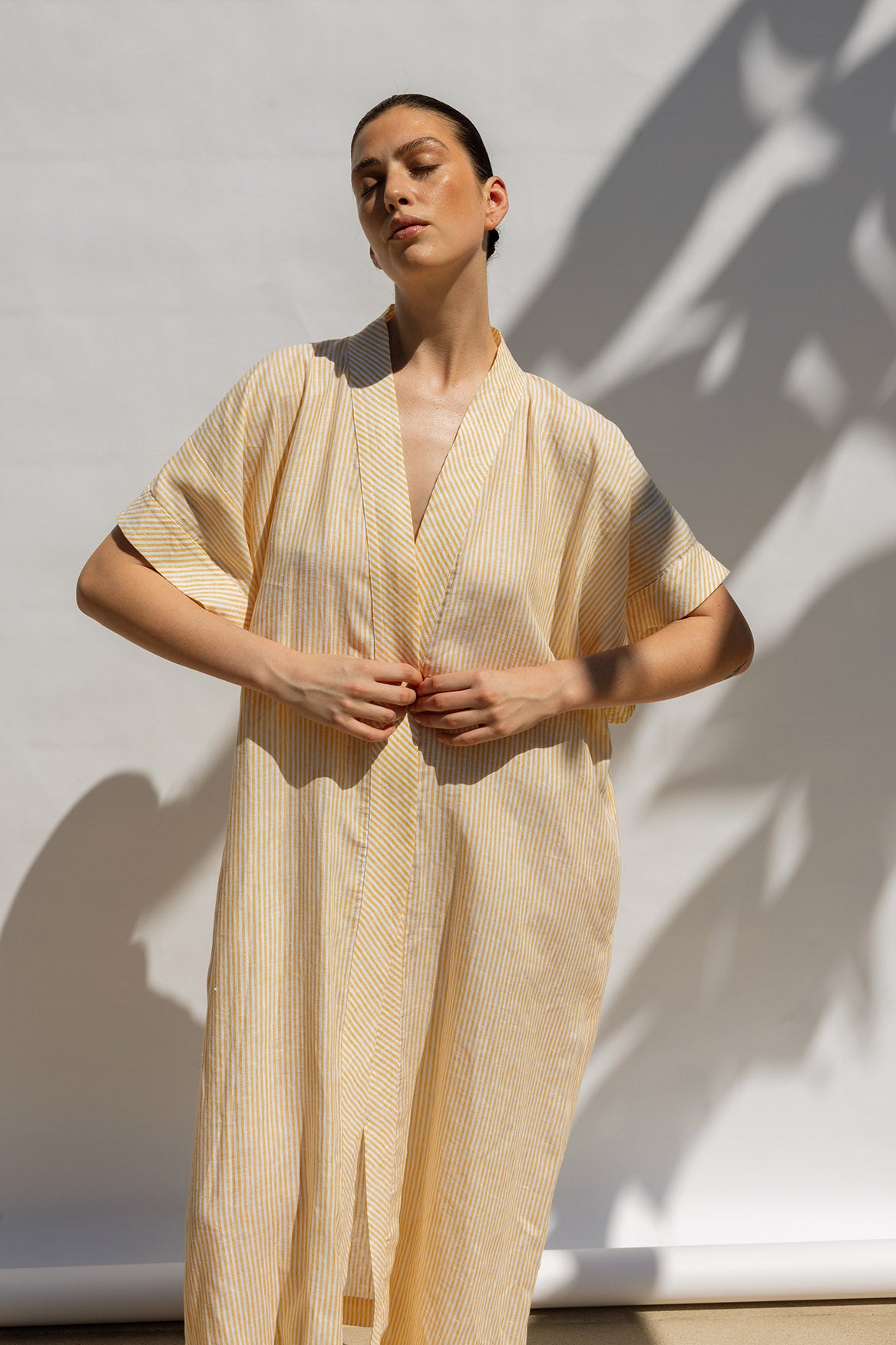 A timeless wrap dress in a classic kimono shape, crafted from 100% linen in a sunny yellow and white stripe. Designed with a waist tie for a flattering fit — wear it wrapped and tied for lunch, or loose over swimwear with a single button fastening. Light, airy, and effortless — a true summer essential.