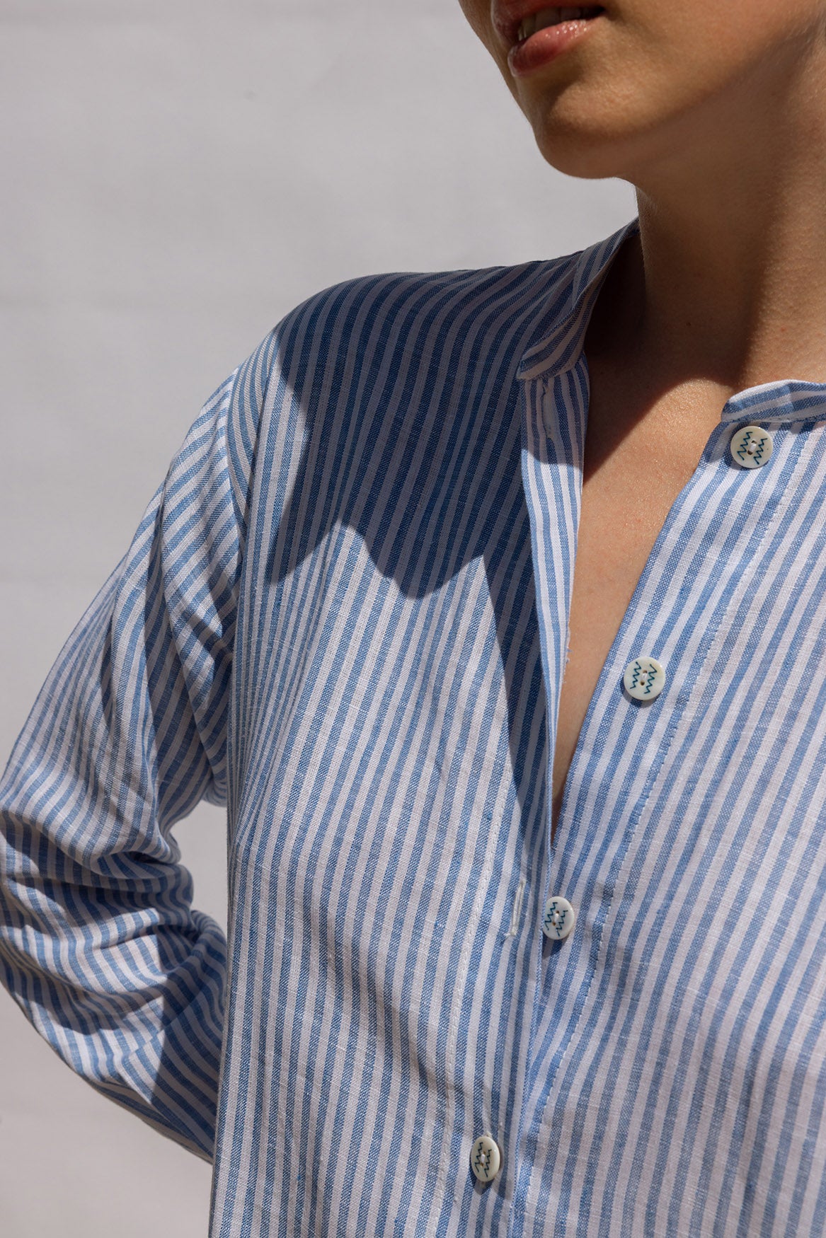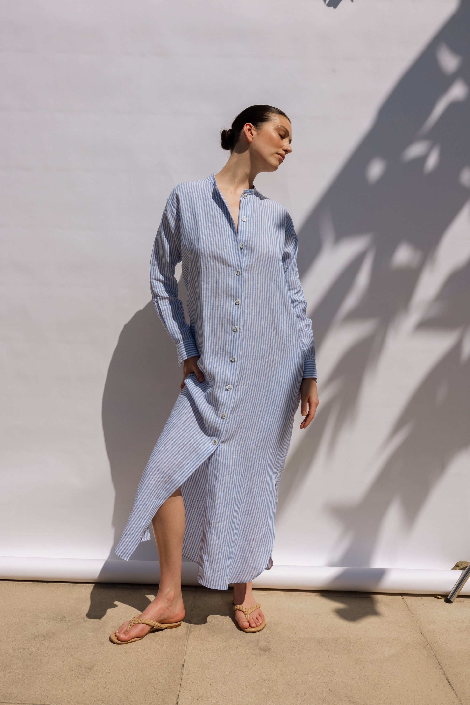 An MGS classic, this longline shirt dress is crafted from 100% linen in a timeless blue and white stripe. With a neat, refined cut, side pockets, and custom MGS buttons, it can be worn open over pants or on its own for effortless summer elegance. Style it with the Holiday Pant for a coordinated set.