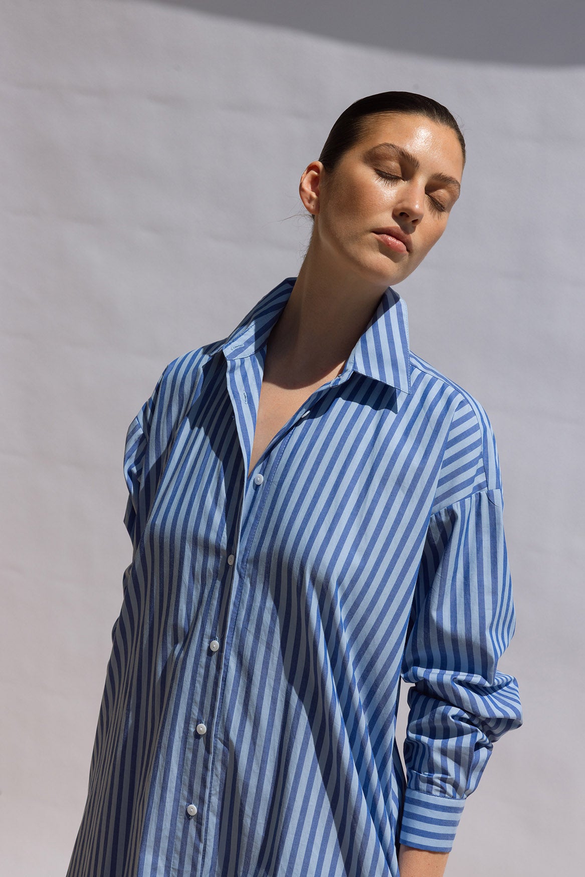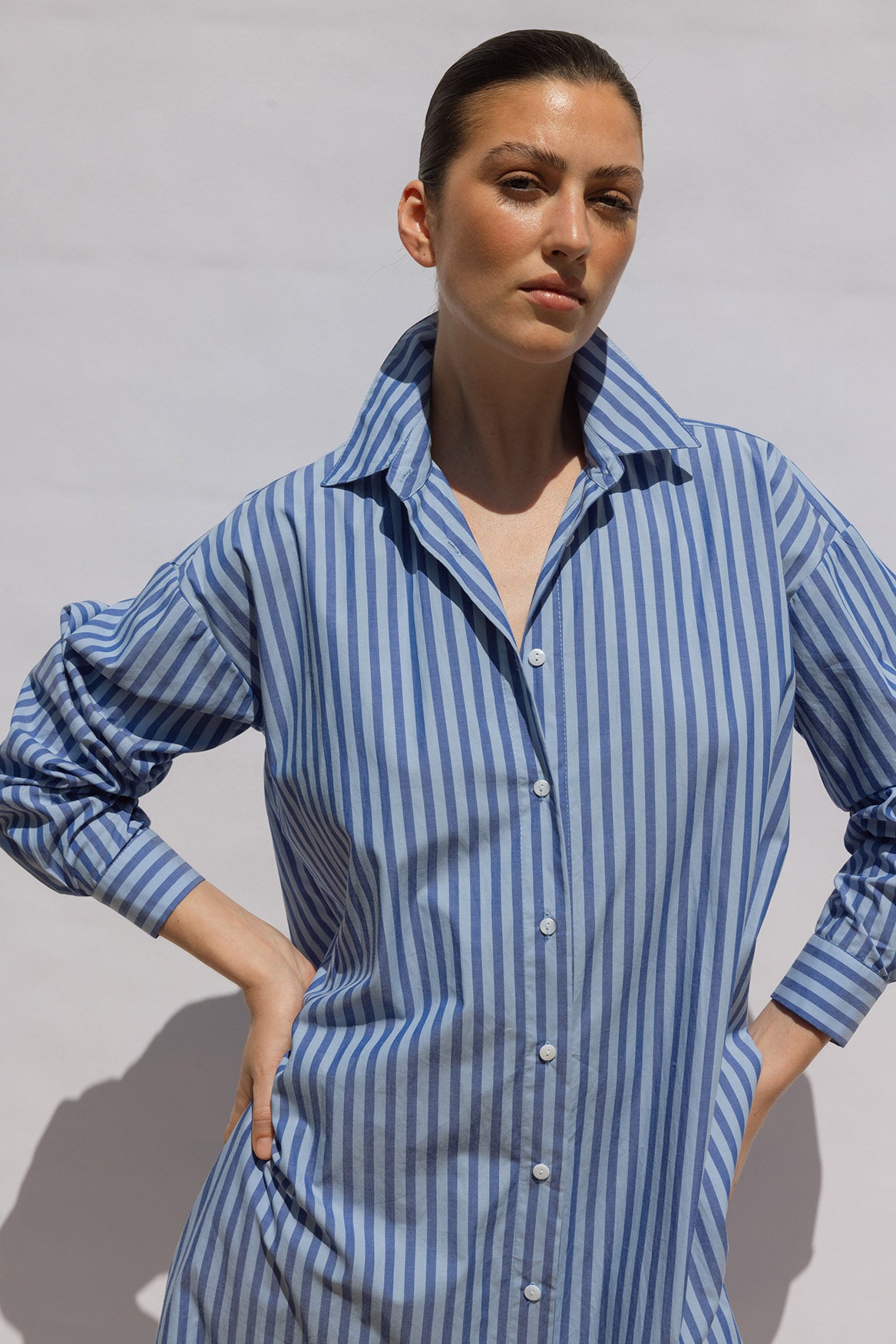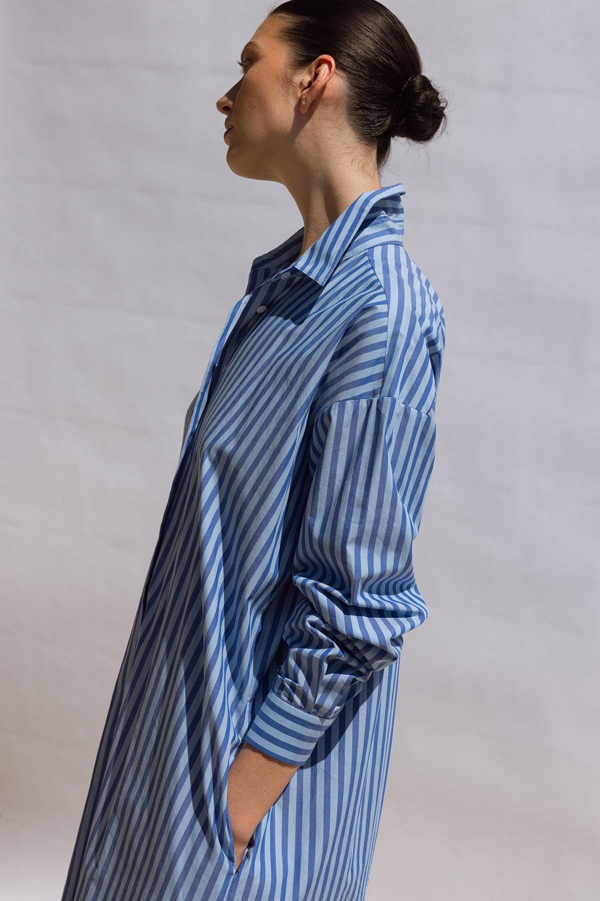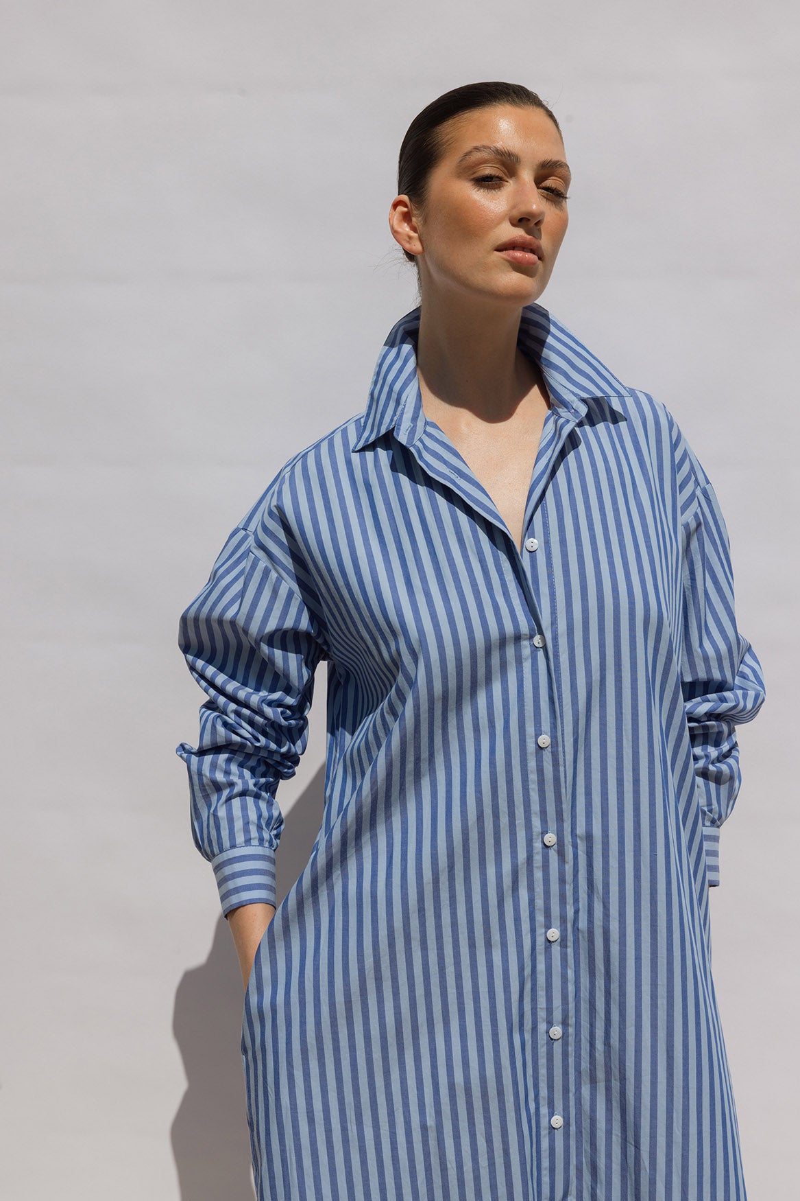 A relaxed, shirt dress crafted from crisp blue-on-blue Japanese cotton. Featuring slight drop shoulders, slouchy side pockets, and our custom buttons, The Marina Shirt Dress is a perfect everyday piece — effortless, comfortable, and elevated. Wear it on its own for relaxed summer days or layer over your favourite pants for versatile, sculptural styling