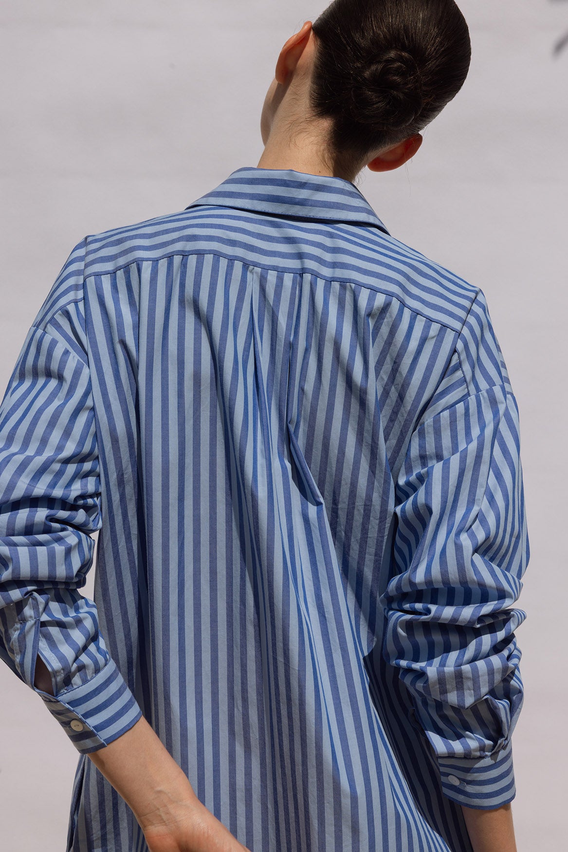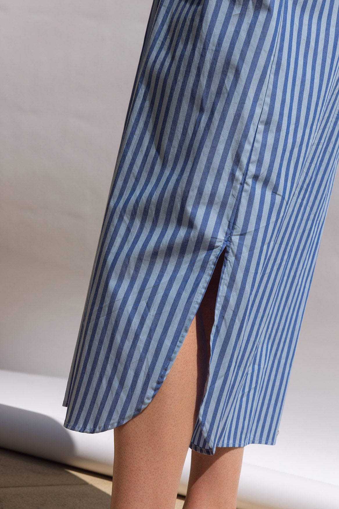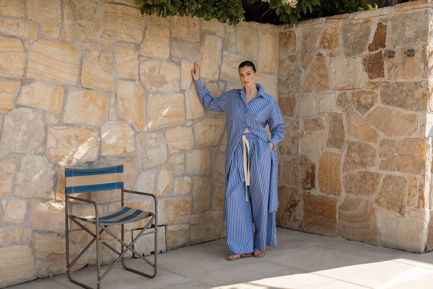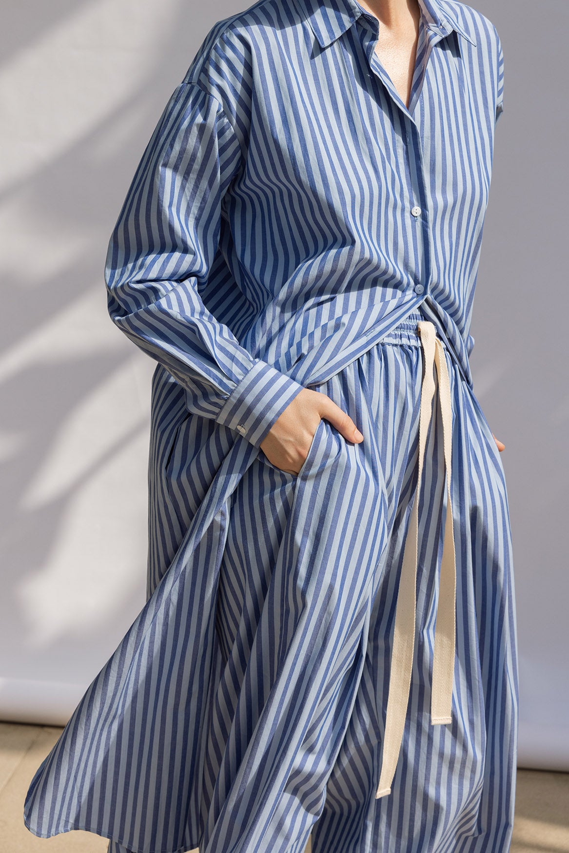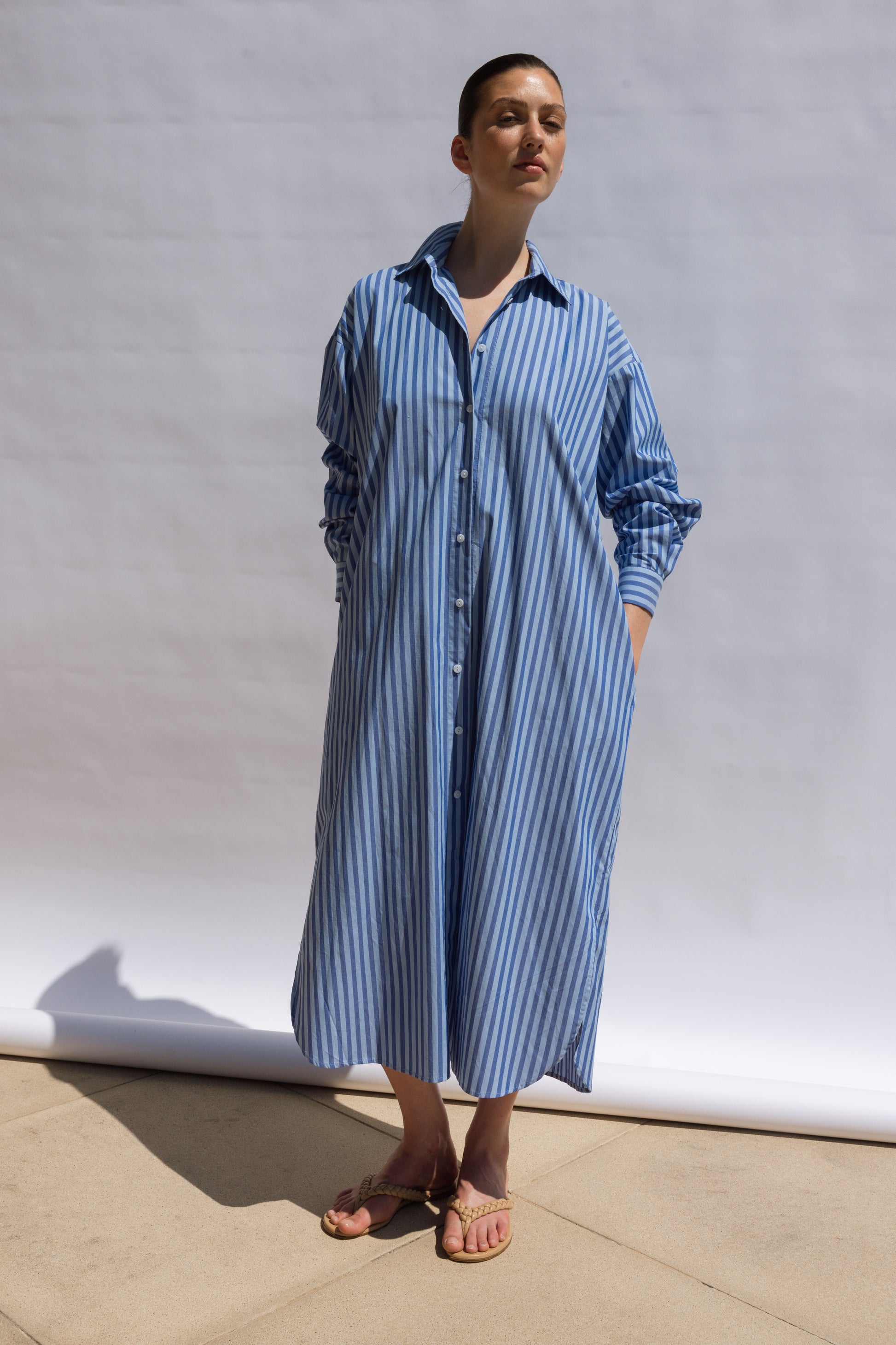 A relaxed, shirt dress crafted from crisp blue-on-blue Japanese cotton. Featuring slight drop shoulders, slouchy side pockets, and our custom buttons, The Marina Shirt Dress is a perfect everyday piece — effortless, comfortable, and elevated. Wear it on its own for relaxed summer days or layer over your favourite pants for versatile, sculptural styling