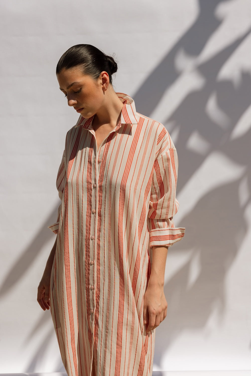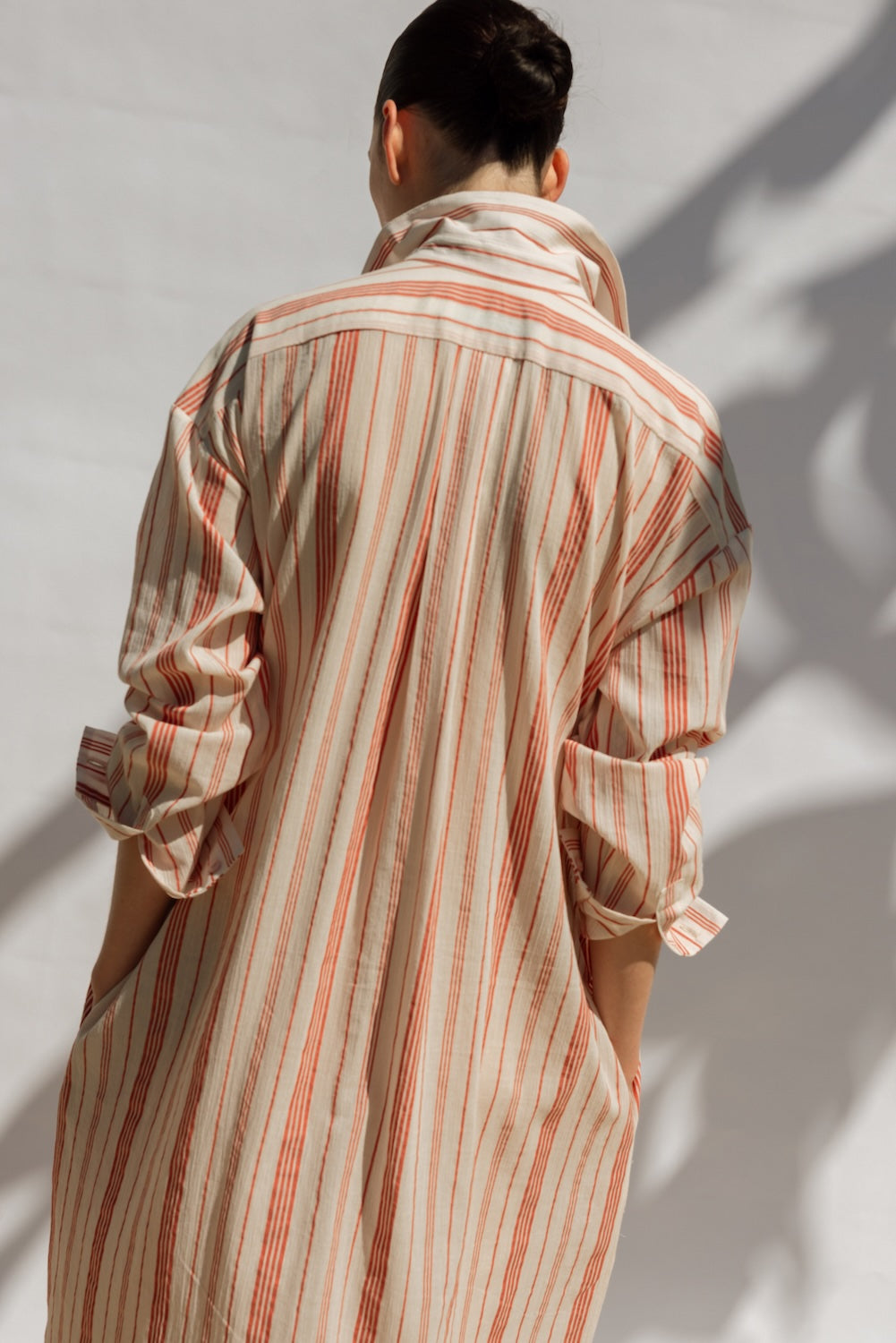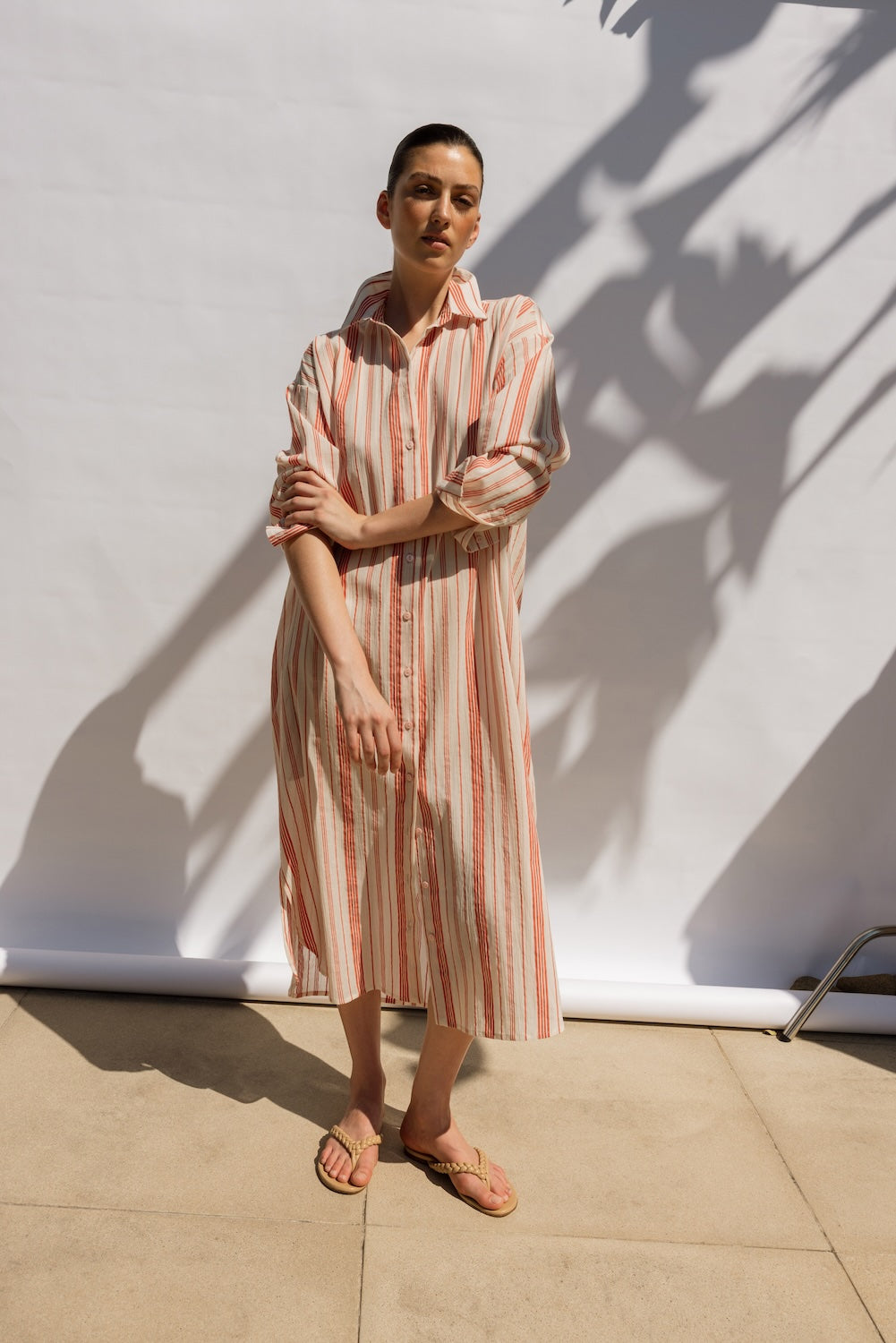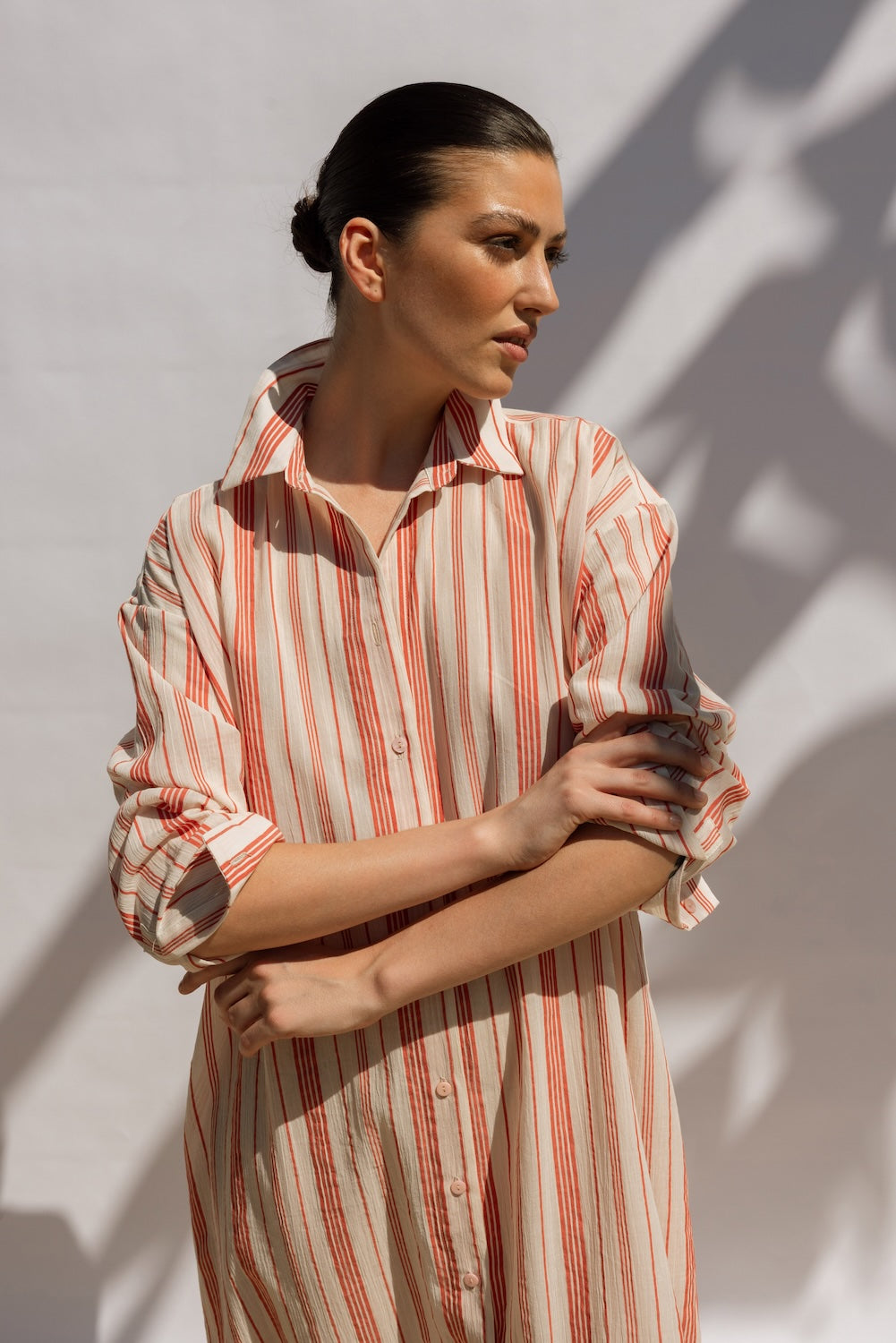 A relaxed shirt dress crafted from soft white cotton gauze with red stripes, The Marina Shirt Dress features gentle drop shoulders, slouchy side pockets, and our signature pink buttons. Effortless, comfortable, and refined, it works beautifully on its own for relaxed summer days, layered over your favourite pants for sculptural styling, or casually worn over swimwear for easy summer living