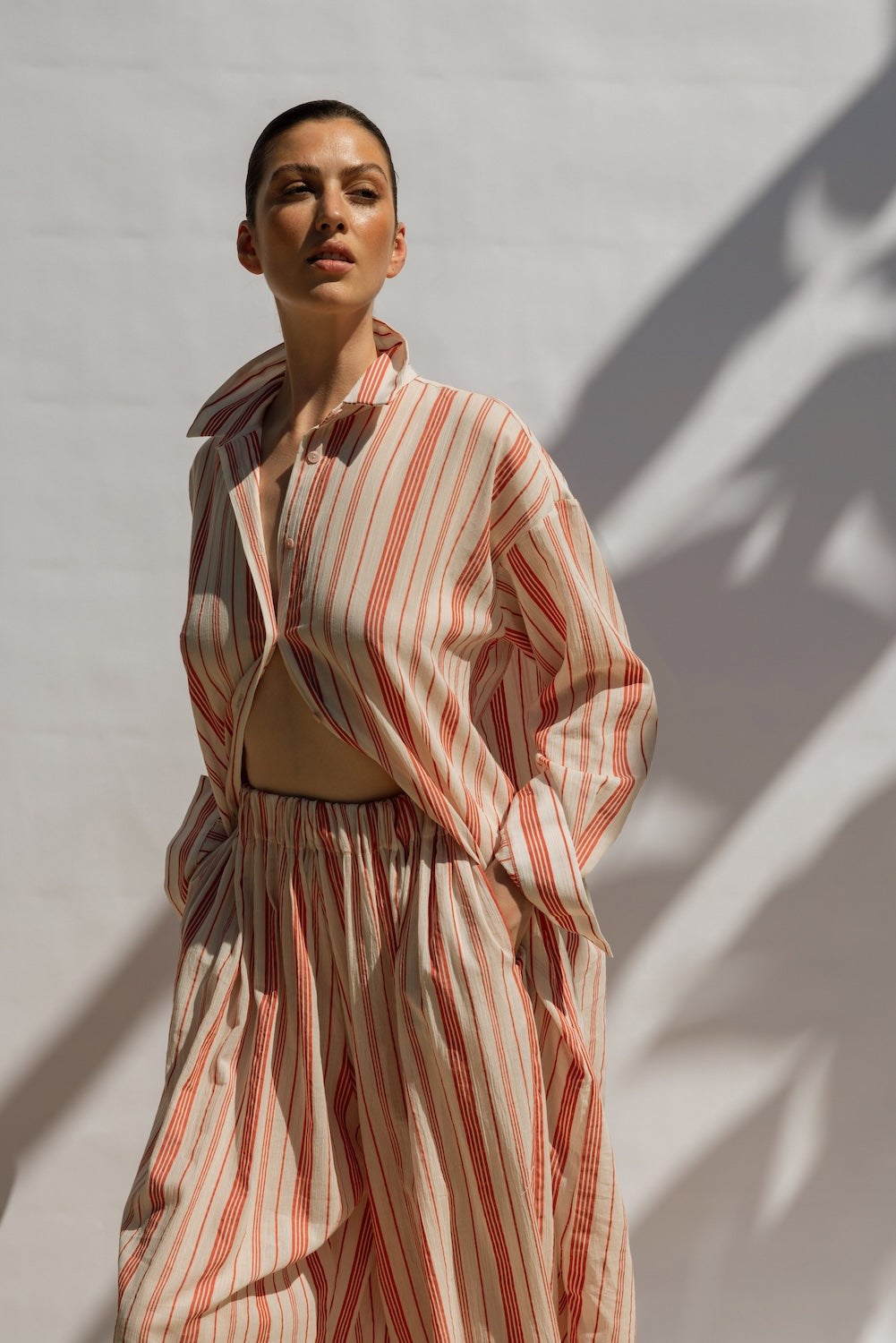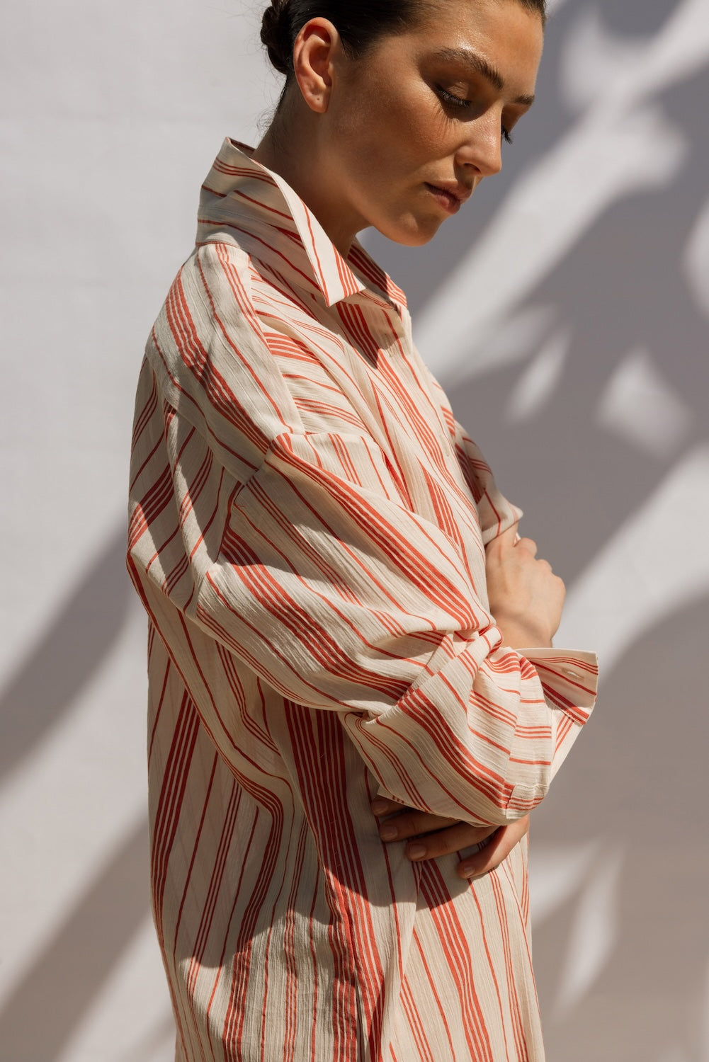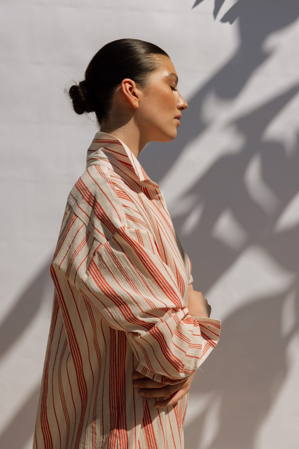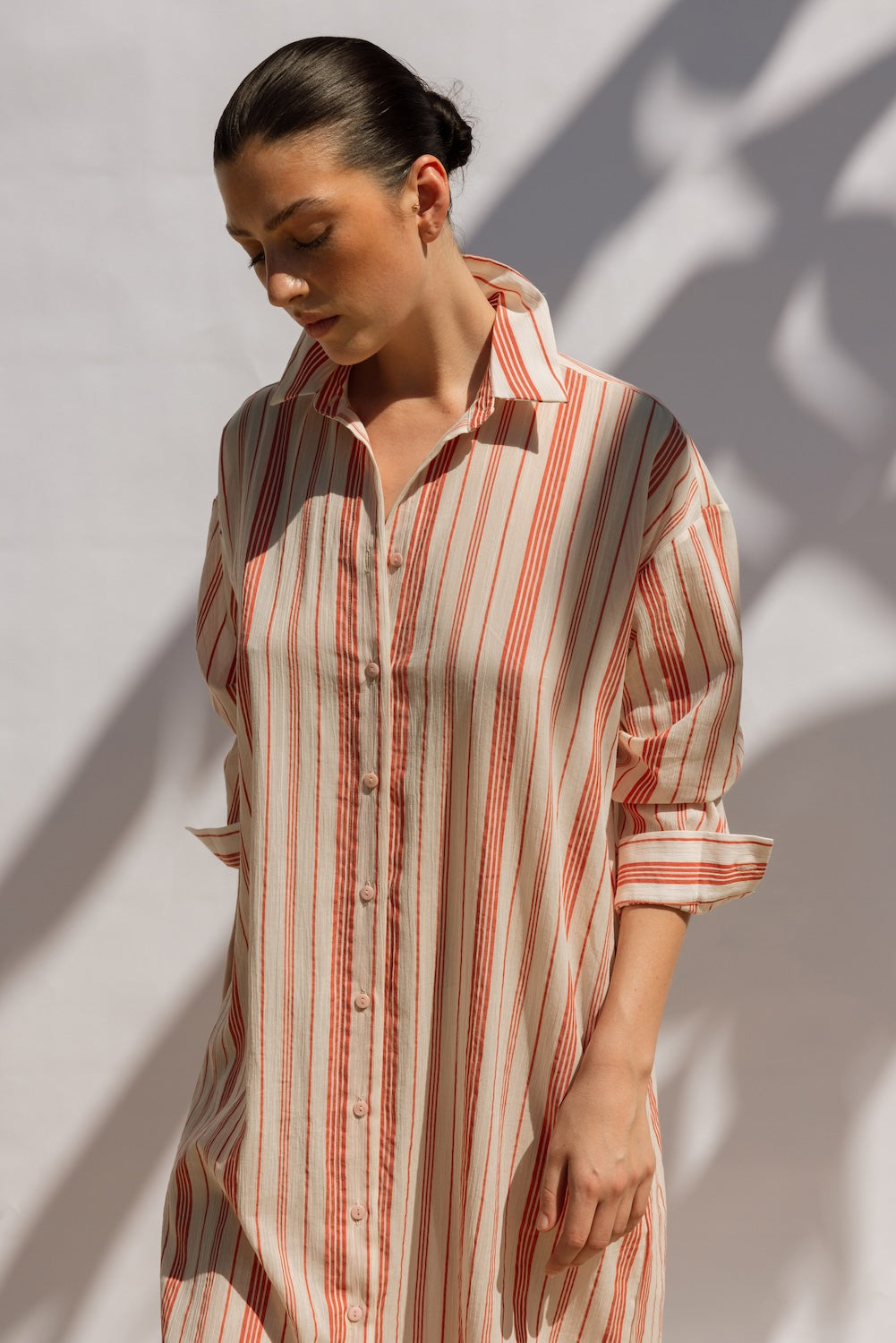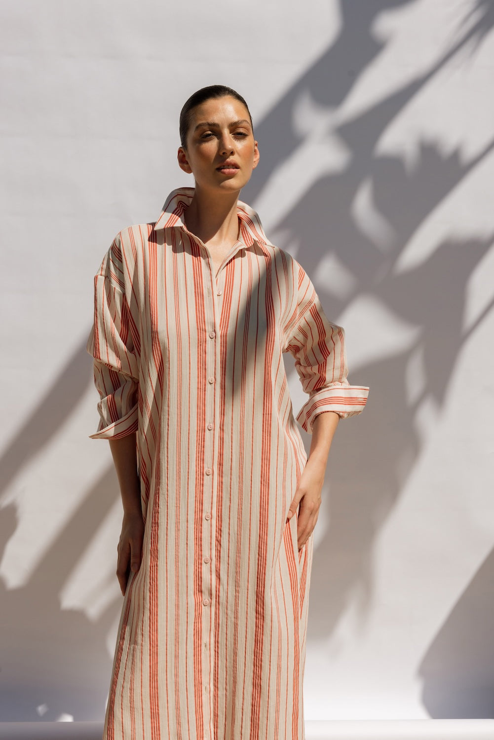 A relaxed shirt dress crafted from soft white cotton gauze with red stripes, The Marina Shirt Dress features gentle drop shoulders, slouchy side pockets, and our signature pink buttons. Effortless, comfortable, and refined, it works beautifully on its own for relaxed summer days, layered over your favourite pants for sculptural styling, or casually worn over swimwear for easy summer living