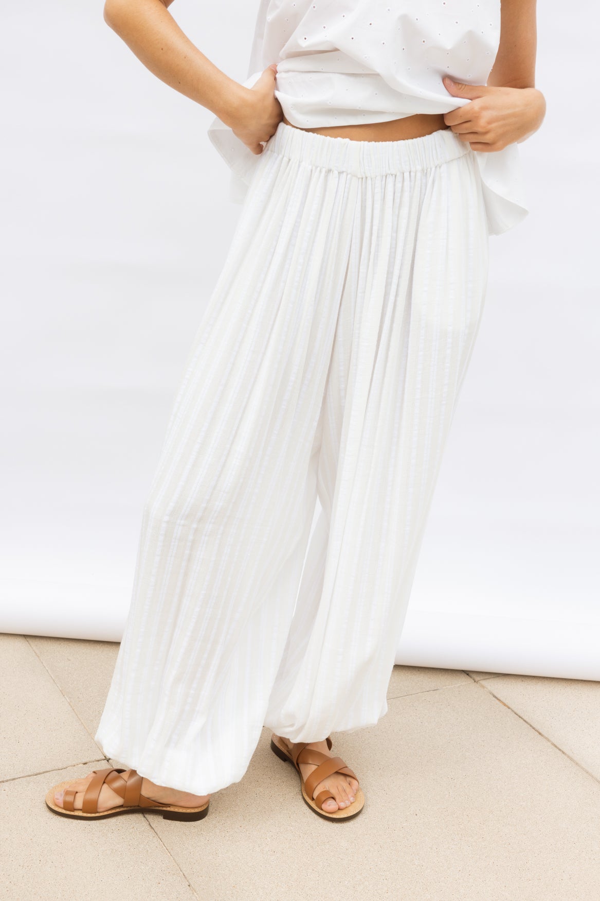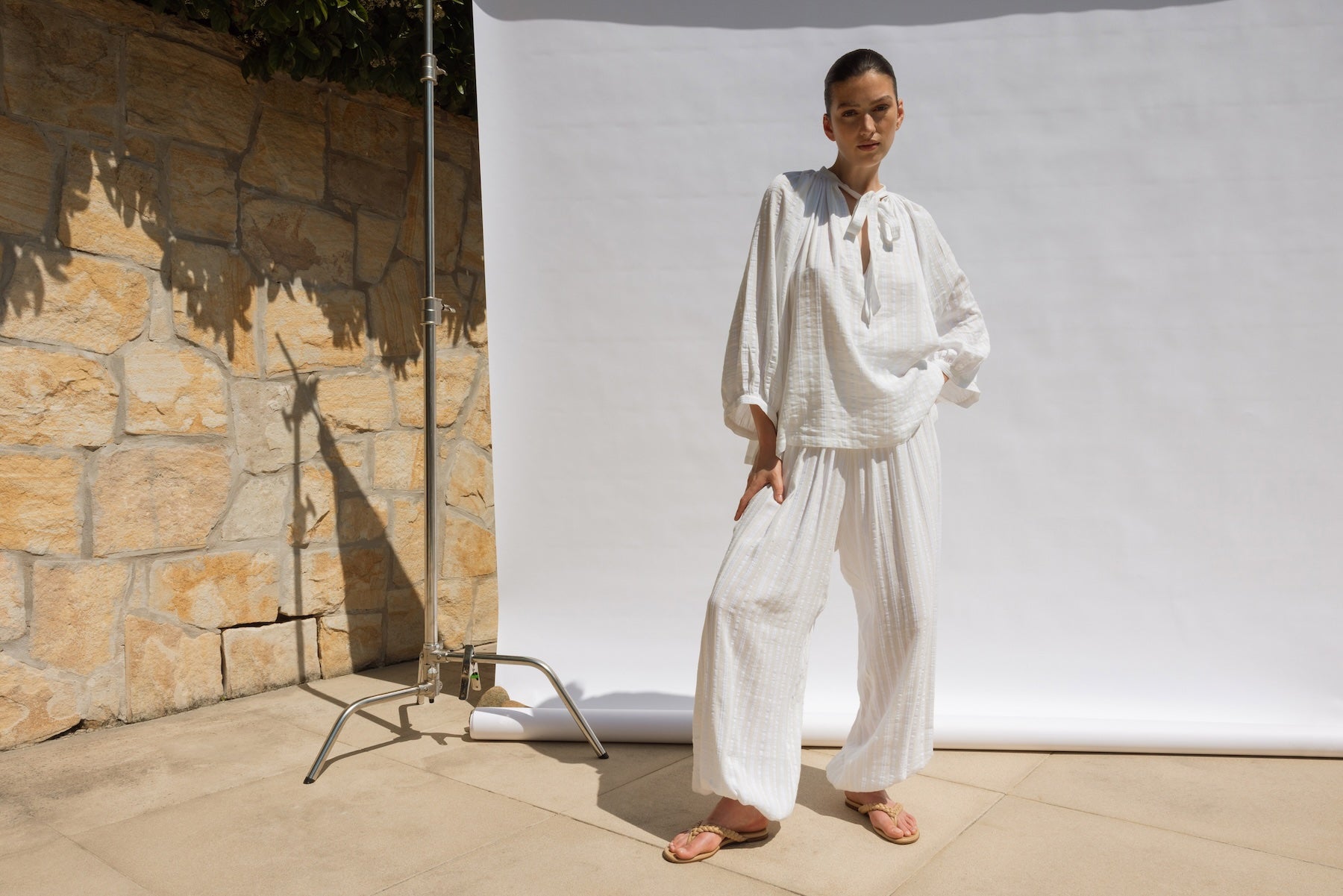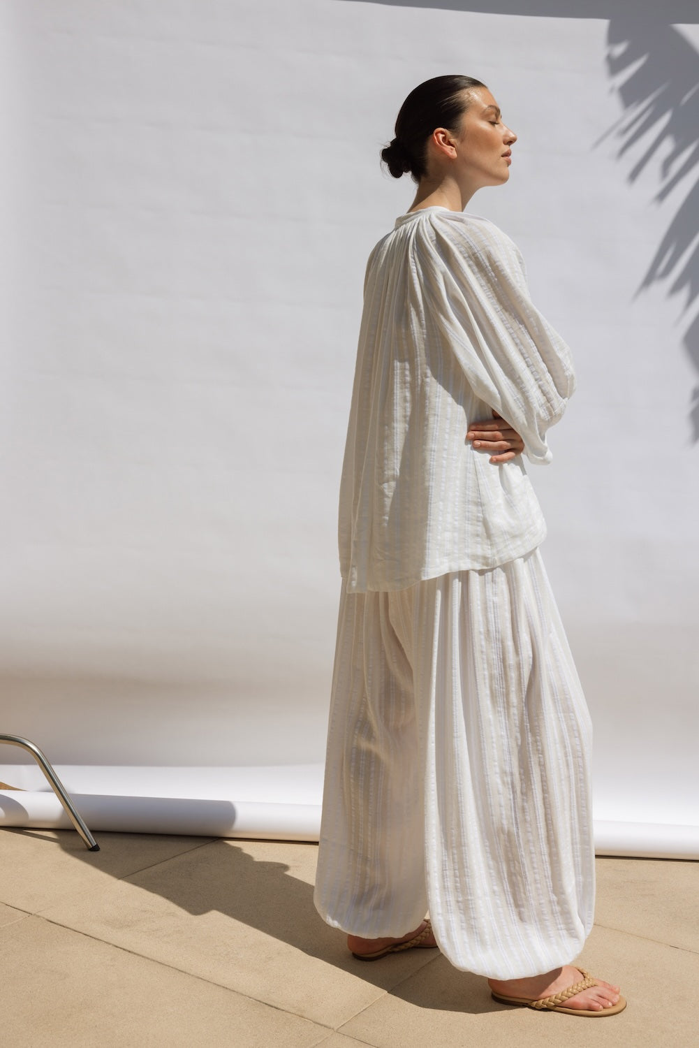 A voluminous, floaty pant crafted in soft white cotton cheesecloth. Designed with an elasticated waist and gently gathered cuffs, the Poet Pant moves with lightness and ease — wear with The Whisper Blouse for a chic relaxed set.