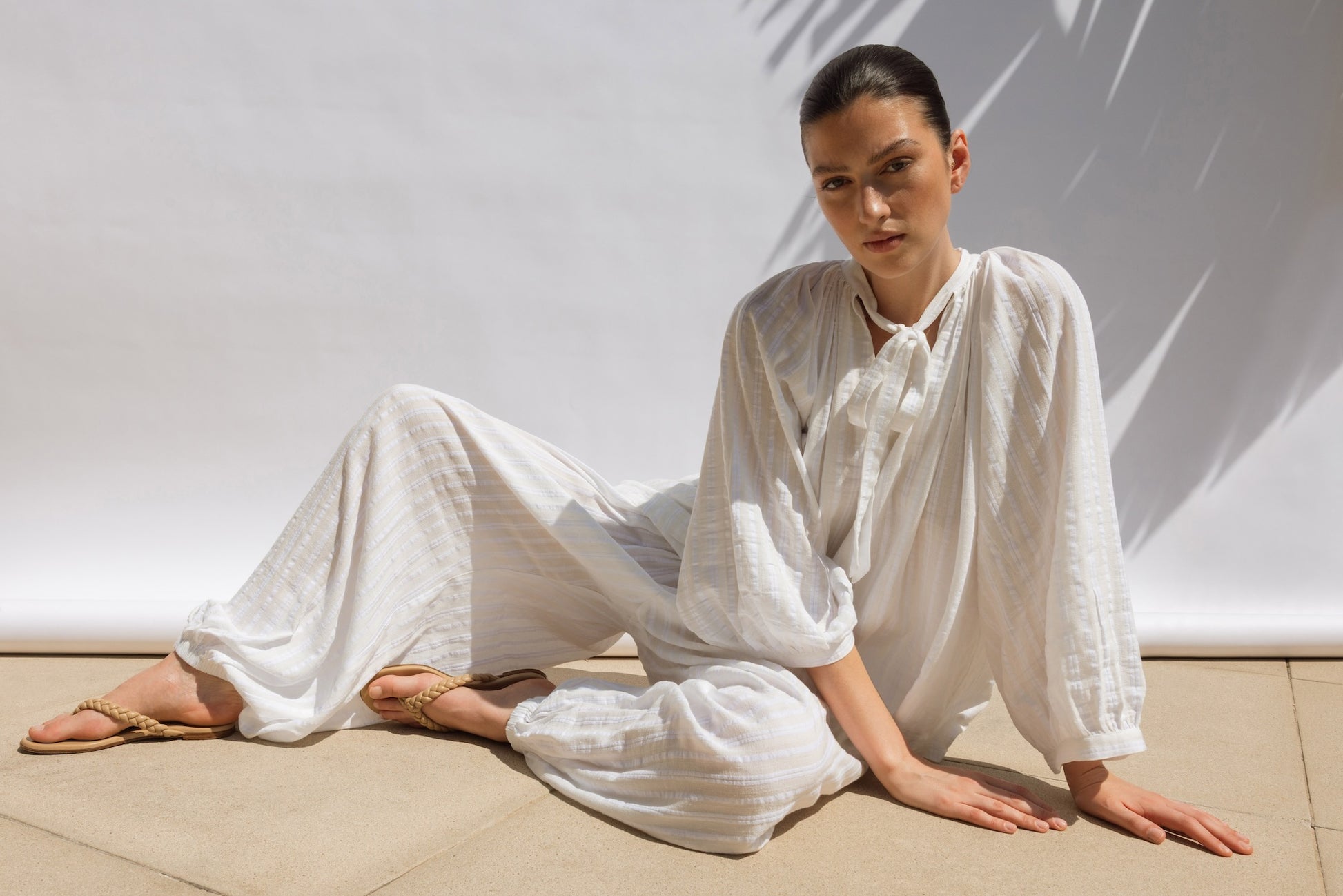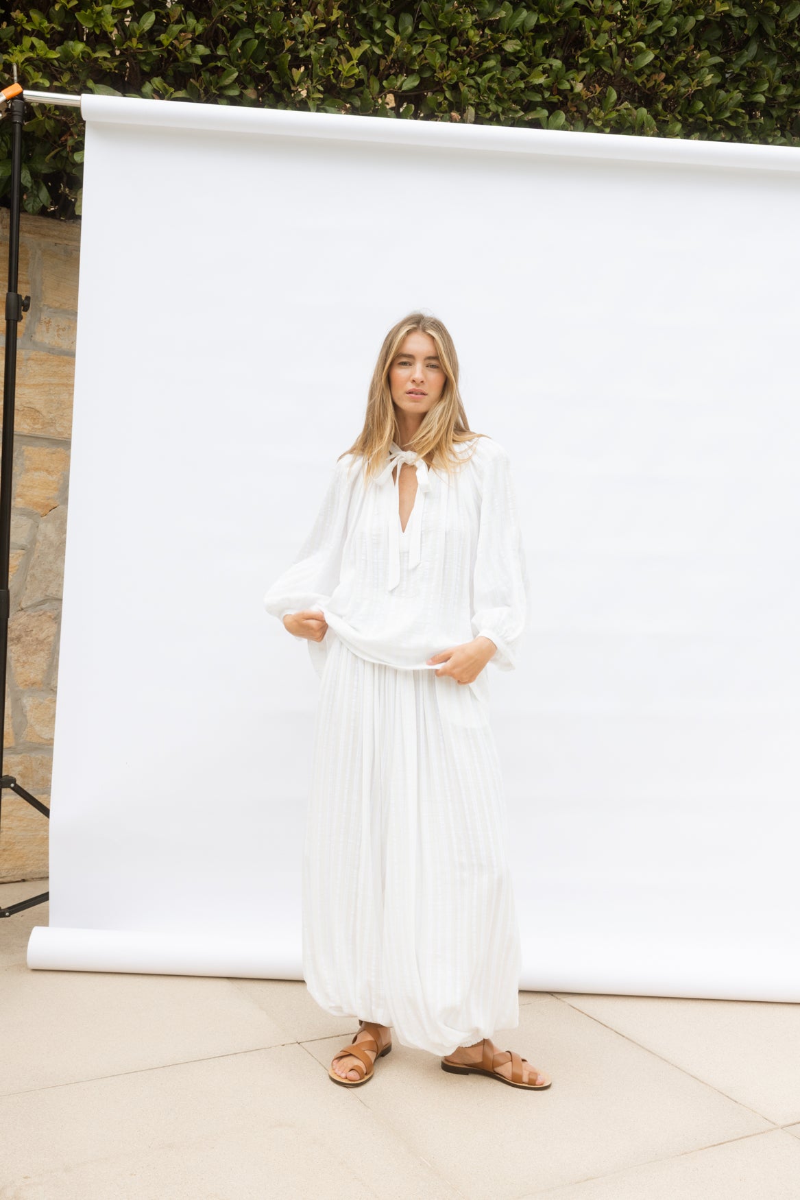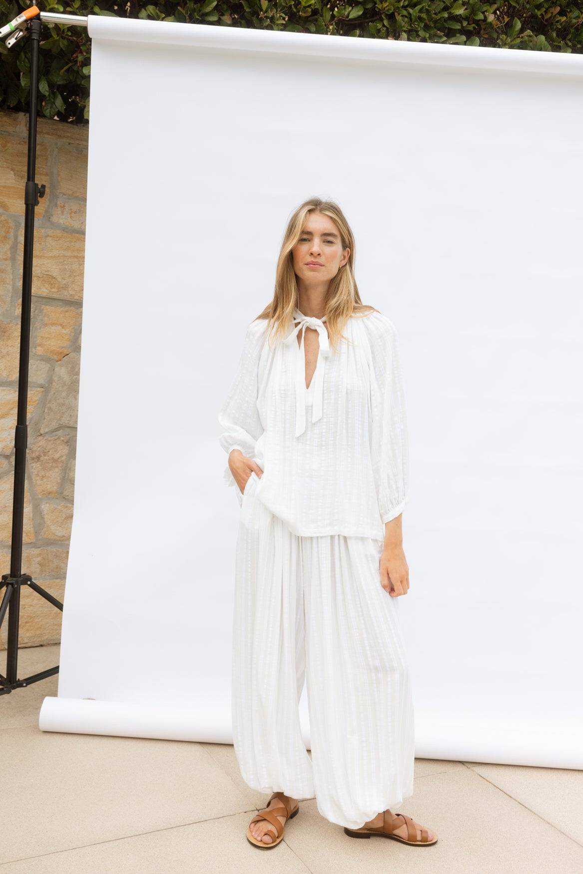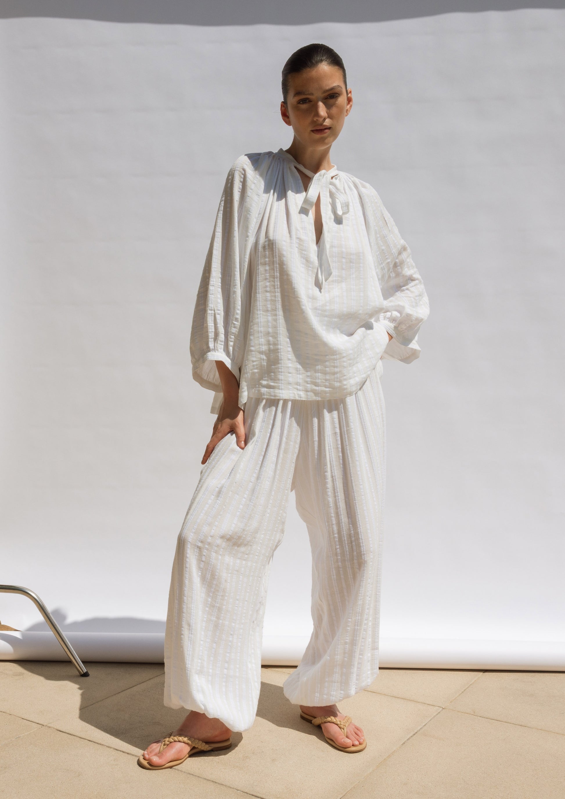 A voluminous, floaty pant crafted in soft white cotton cheesecloth. Designed with an elasticated waist and gently gathered cuffs, the Poet Pant moves with lightness and ease — wear with The Whisper Blouse for a chic relaxed set.