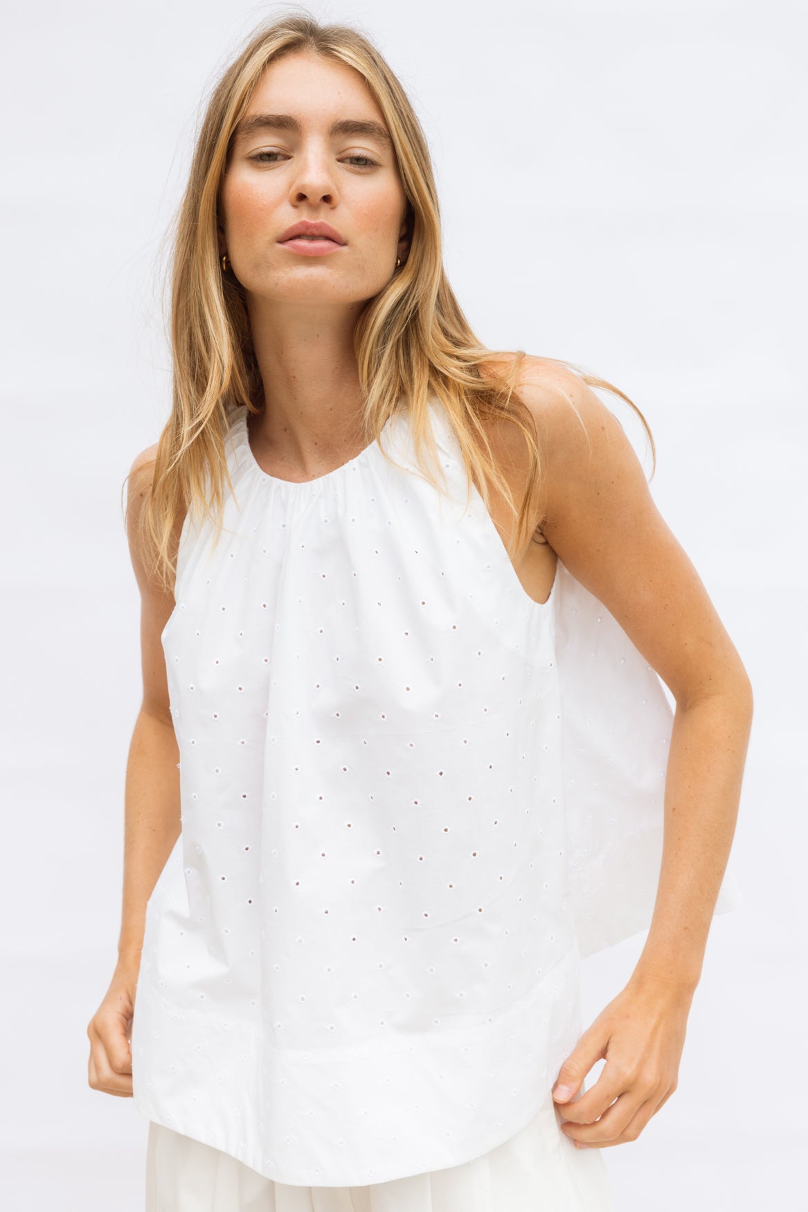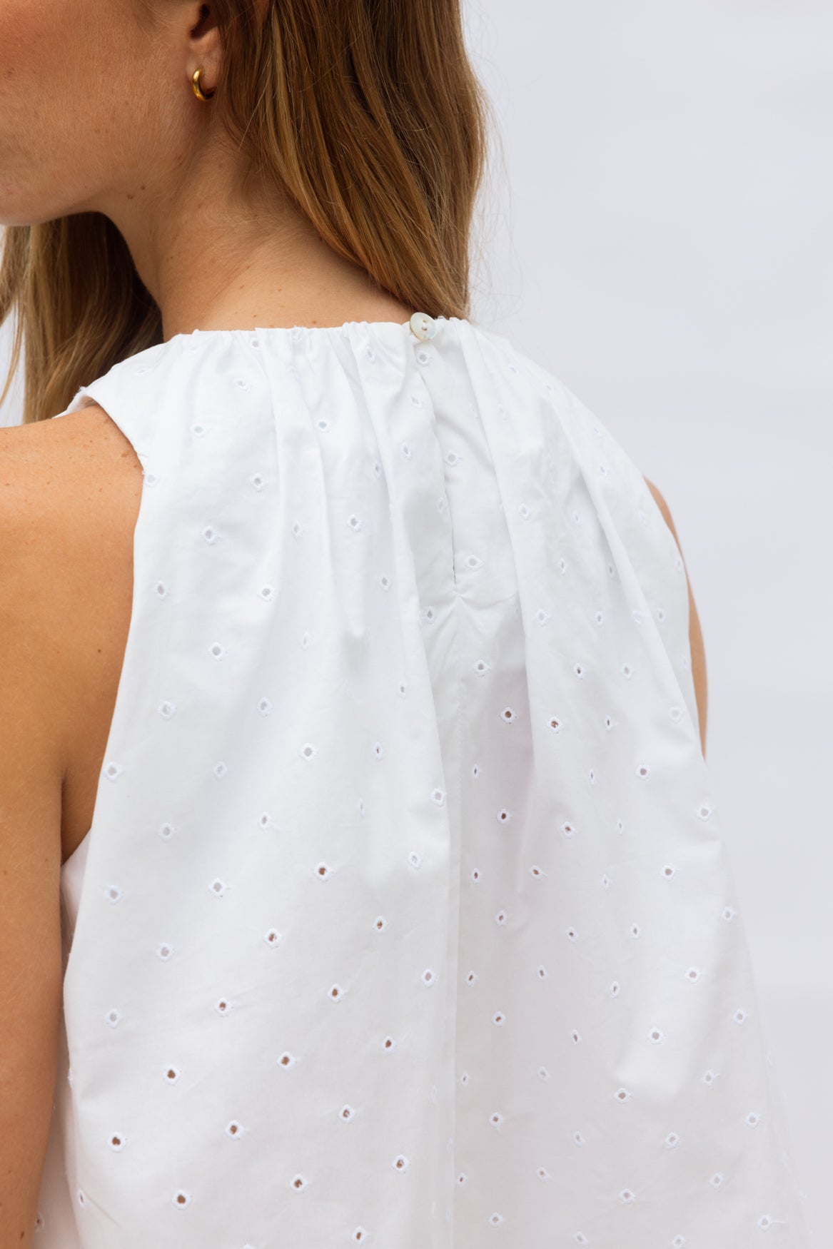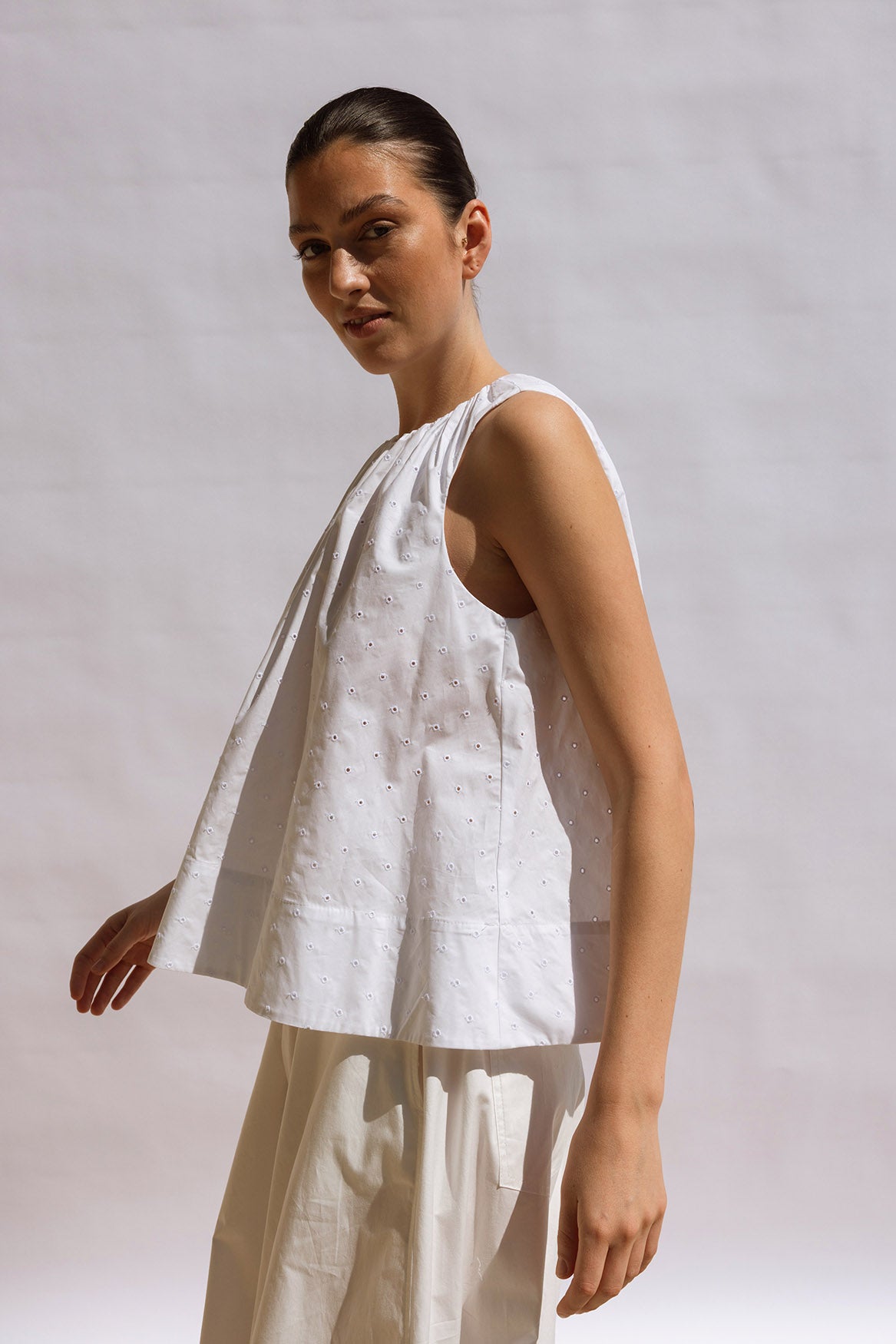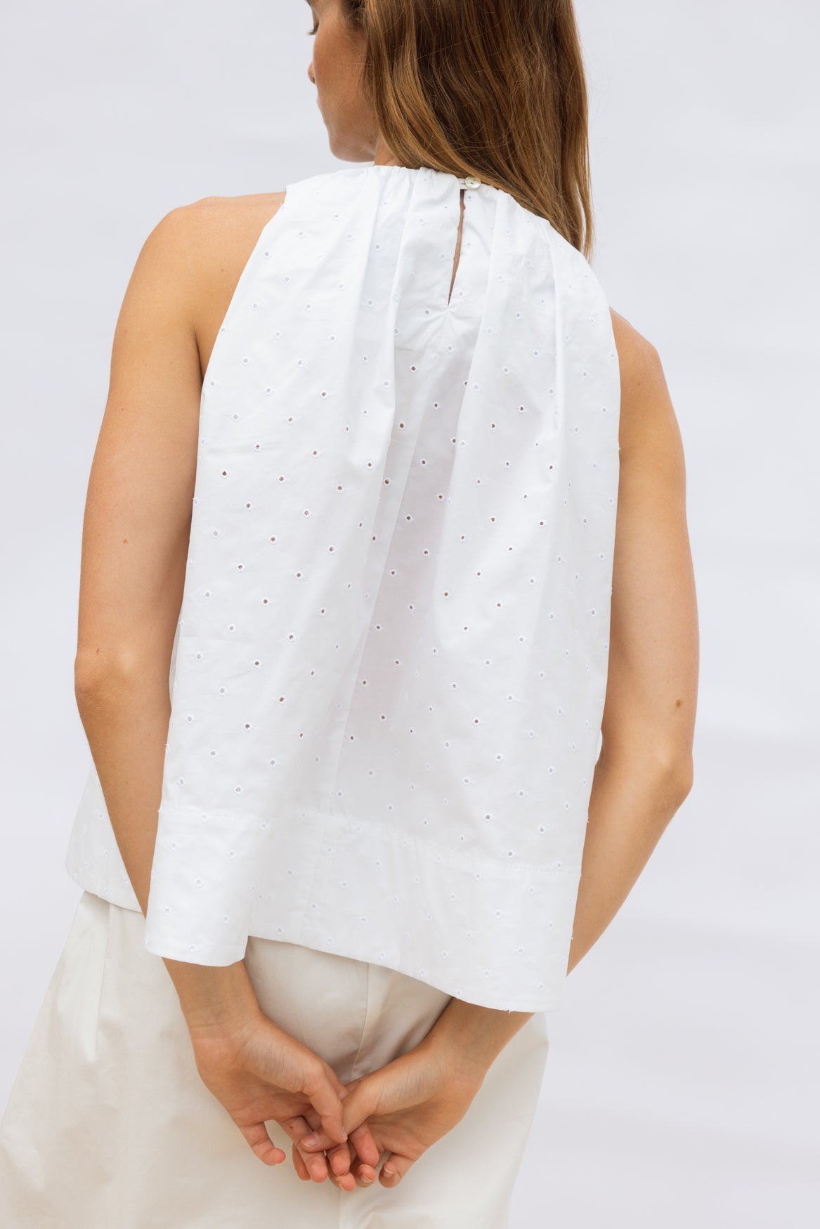 A fresh, airy summer top in crisp white Cotton Broderie, featuring a centre-back button fastening. Voluminous and sculptural, it pairs effortlessly with all our pants for an elevated, effortless summer look