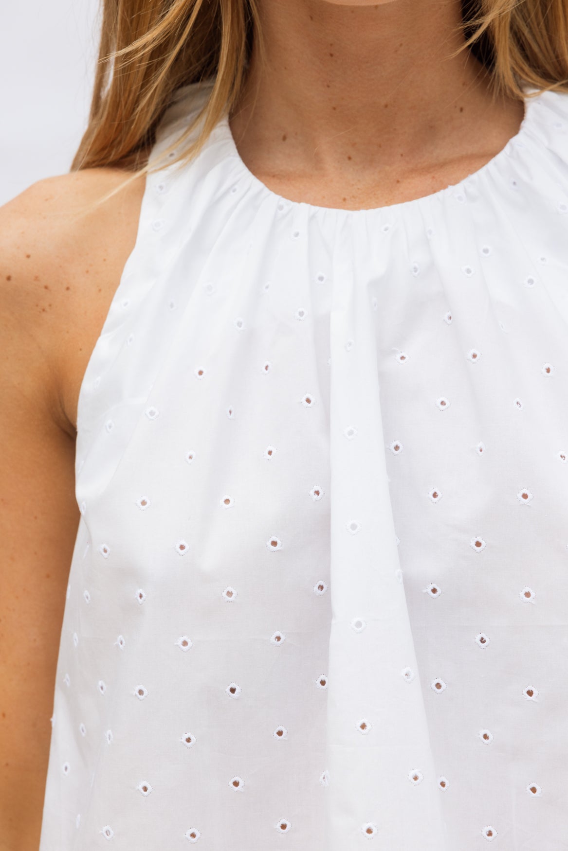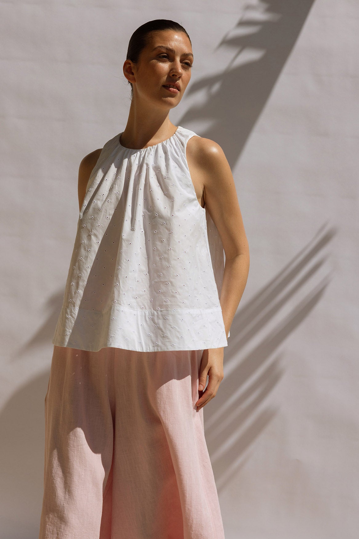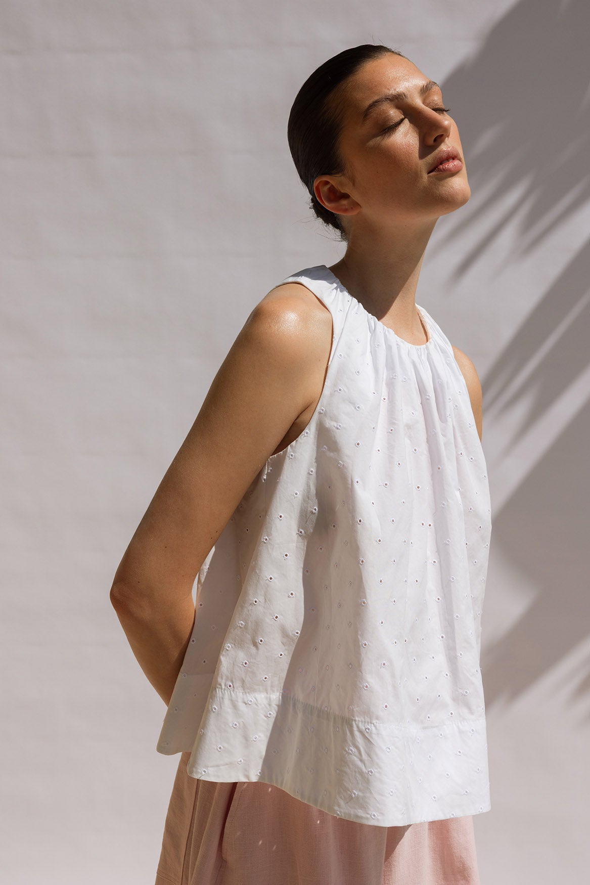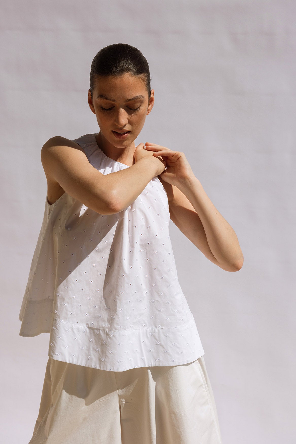 A fresh, airy summer top in crisp white Cotton Broderie, featuring a centre-back button fastening. Voluminous and sculptural, it pairs effortlessly with all our pants for an elevated, effortless summer look