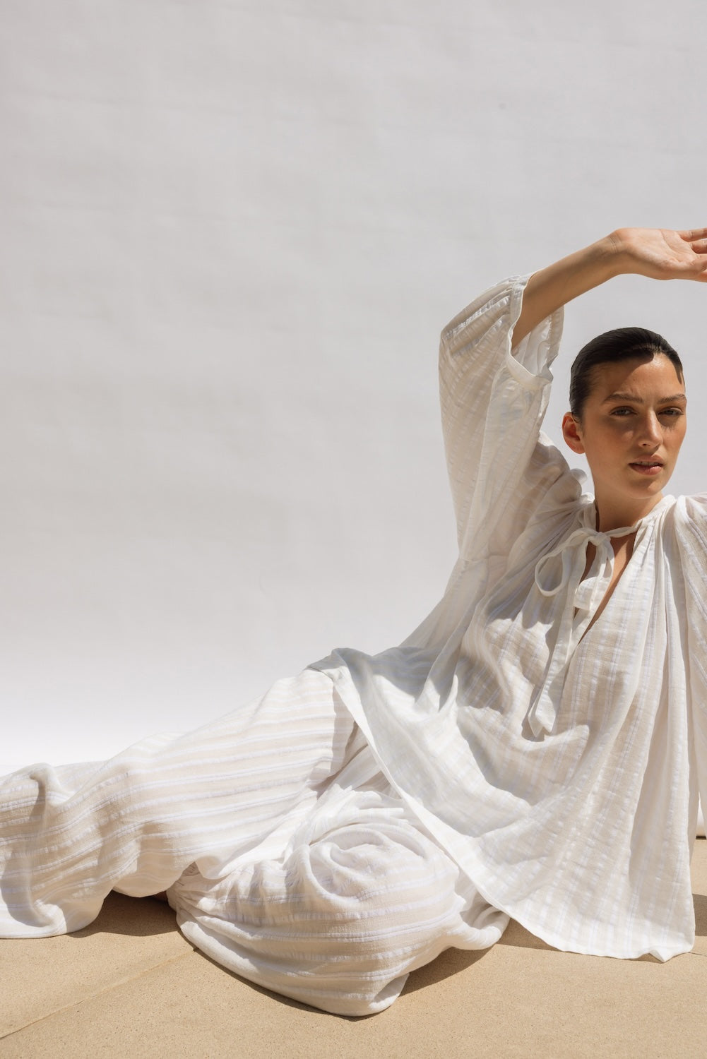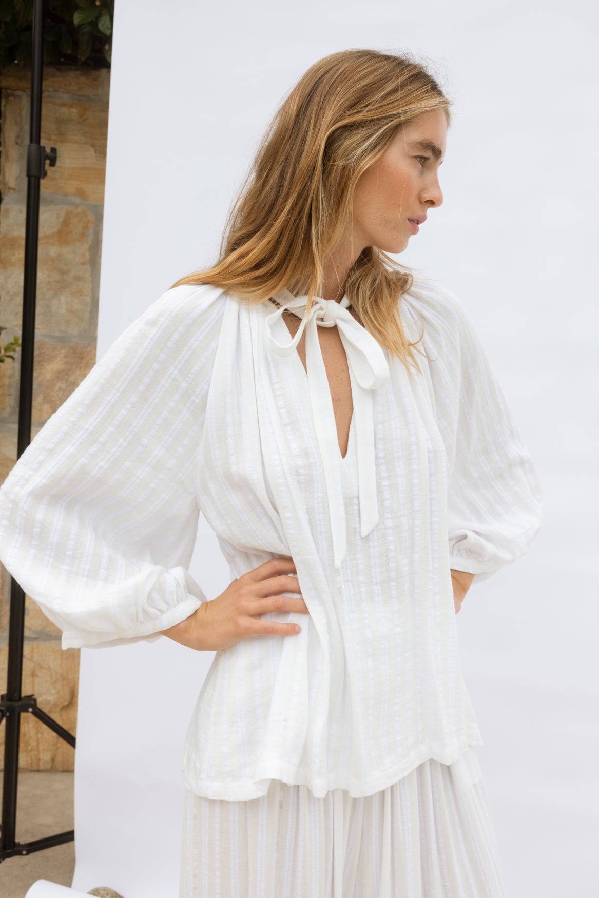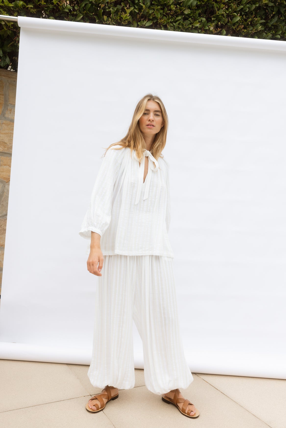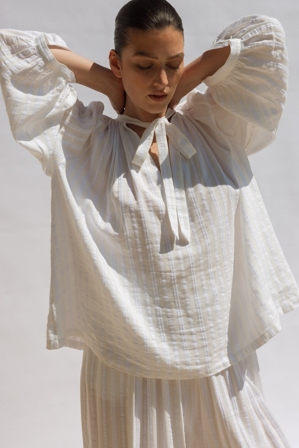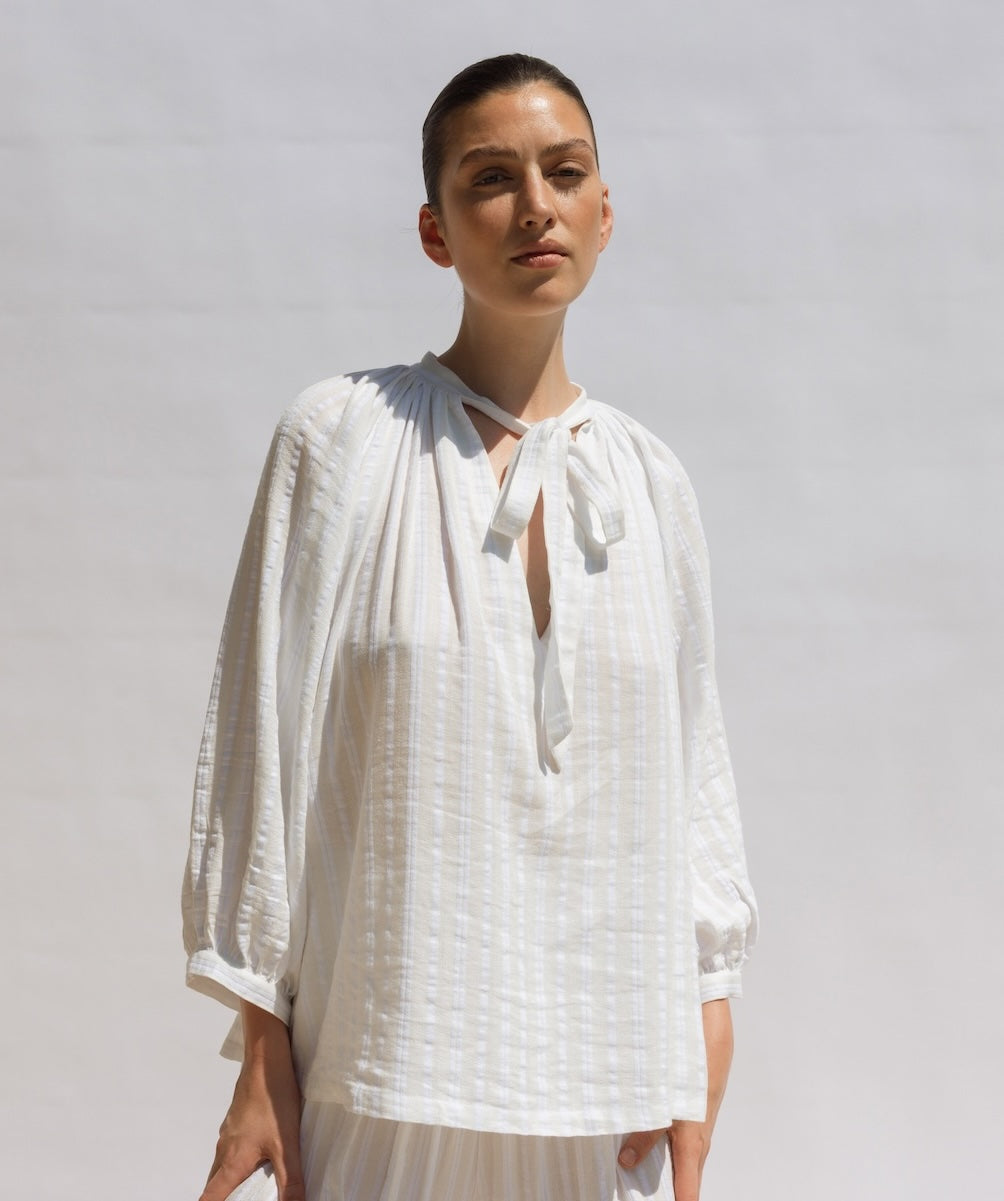 Beautifully crafted in soft white cotton cheesecloth, The Whisper Blouse features a gathered neckline, centre-front tie, and voluminous balloon sleeves. Floaty and effortless, it works beautifully on its own or paired with The Poet Pant for a chic, relaxed set.