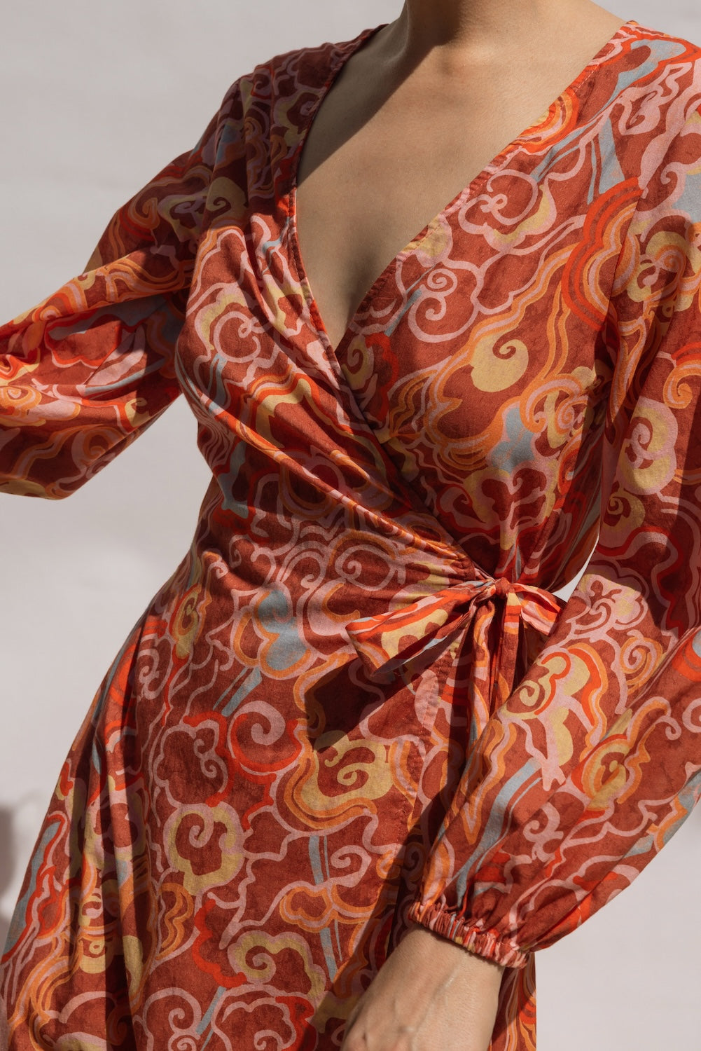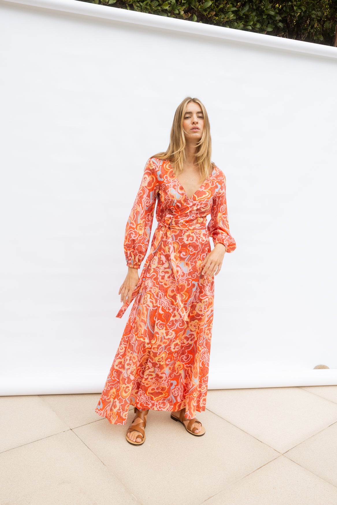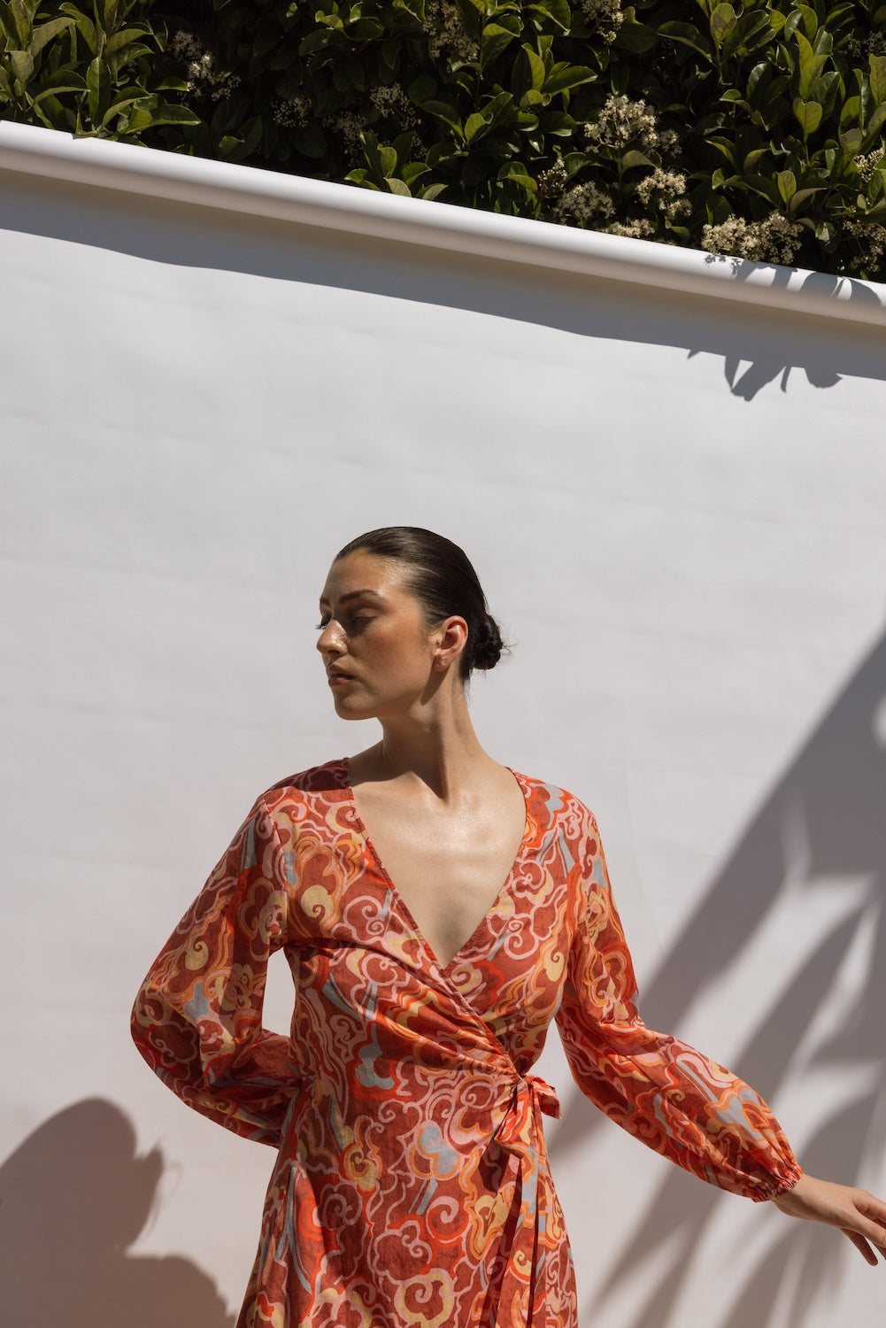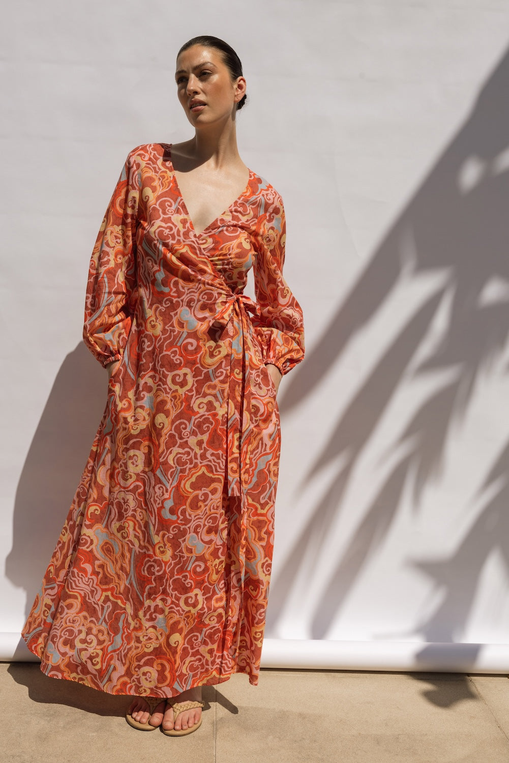 A timeless wrap dress in a relaxed, feminine silhouette — made for sunlit days and long summer evenings. Crafted from a Summer weight cotton, it features softly billowing sleeves with elasticated cuffs and is cut in a playful pink filigree print, with a classic shape updated for relaxed, refined summer dressing.