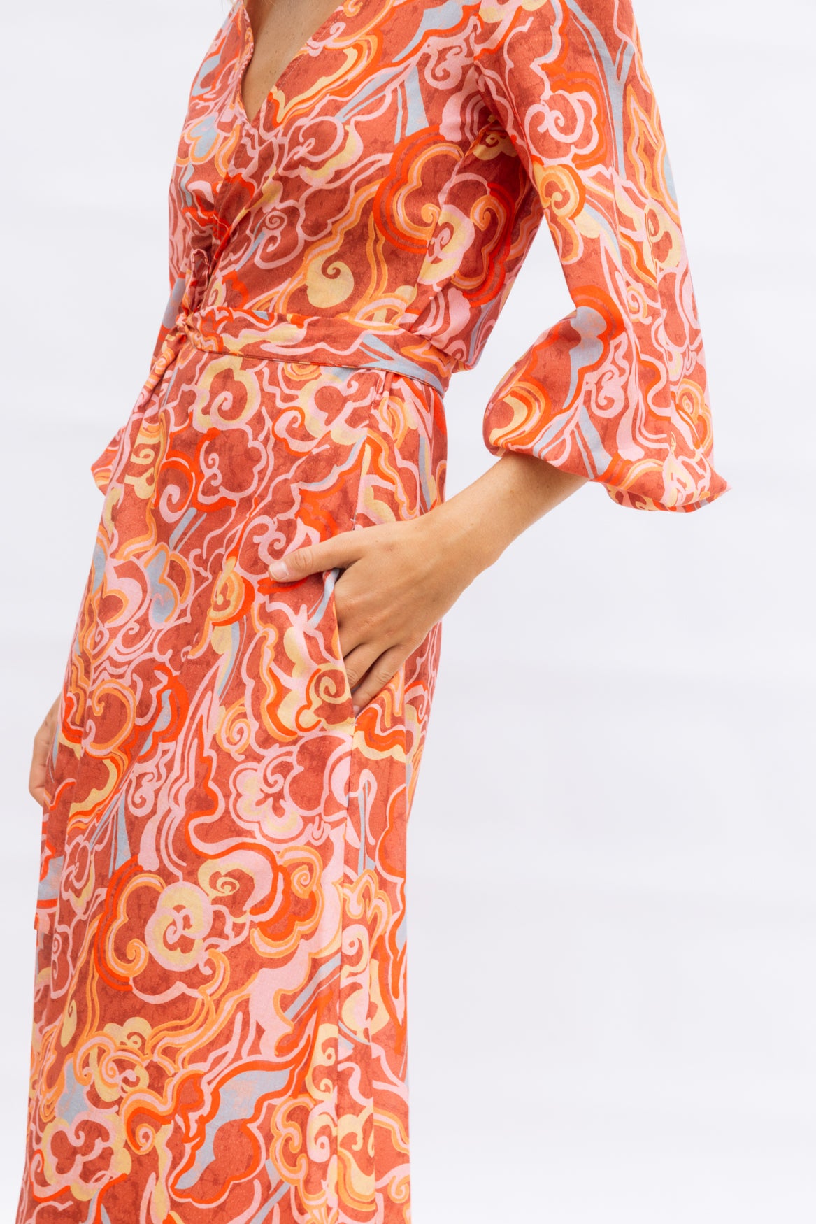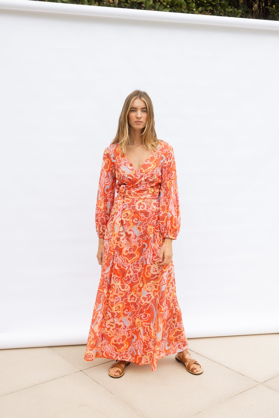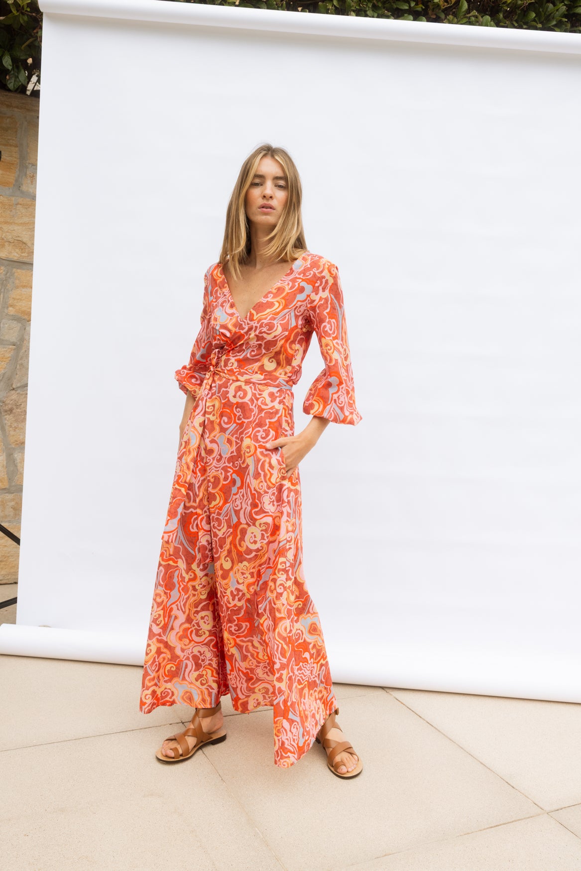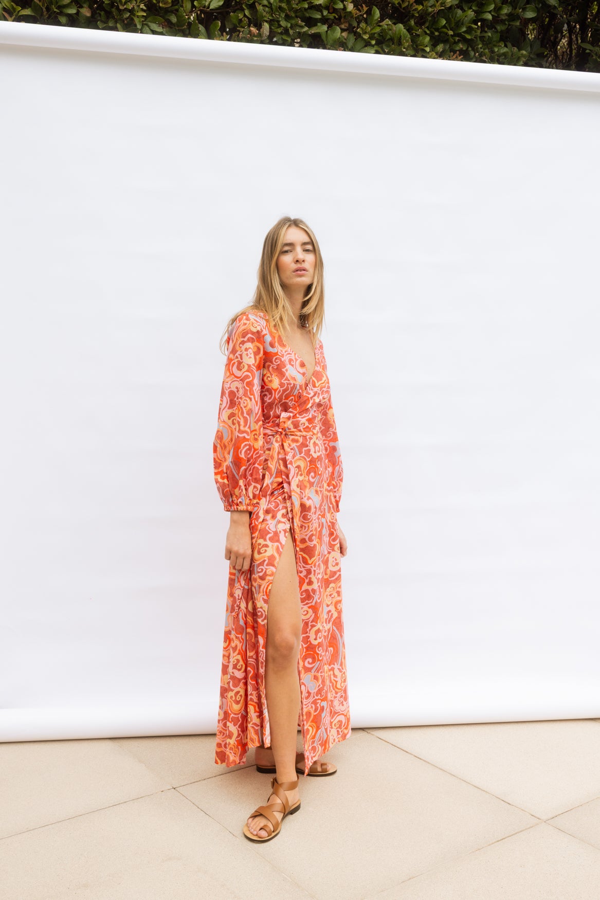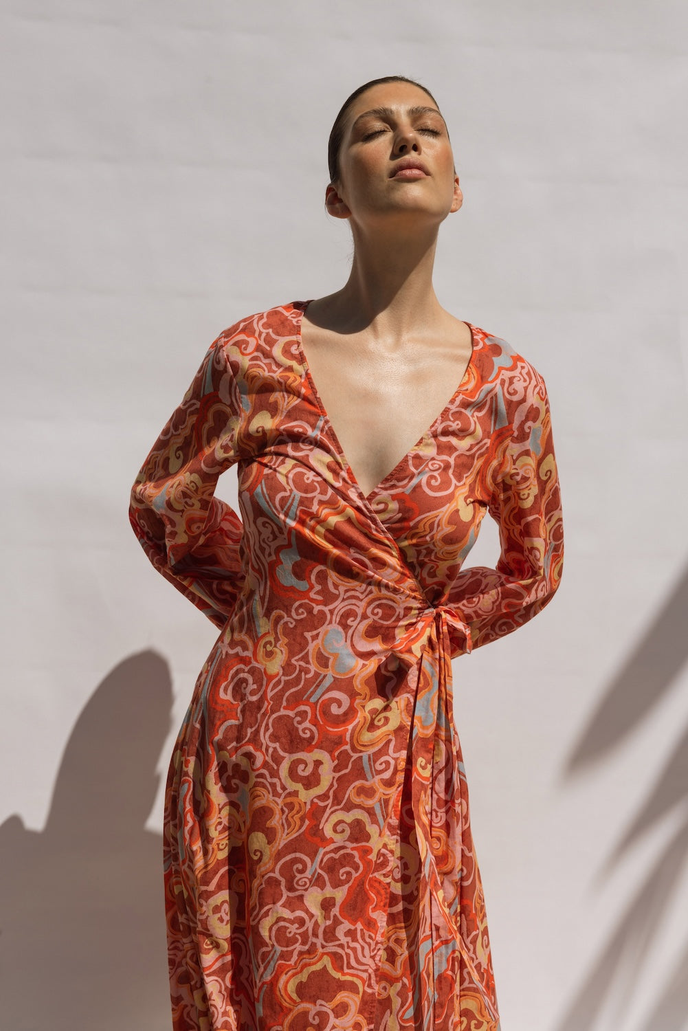 A timeless wrap dress in a relaxed, feminine silhouette — made for sunlit days and long summer evenings. Crafted from a Summer weight cotton, it features softly billowing sleeves with elasticated cuffs and is cut in a playful pink filigree print, with a classic shape updated for relaxed, refined summer dressing.
